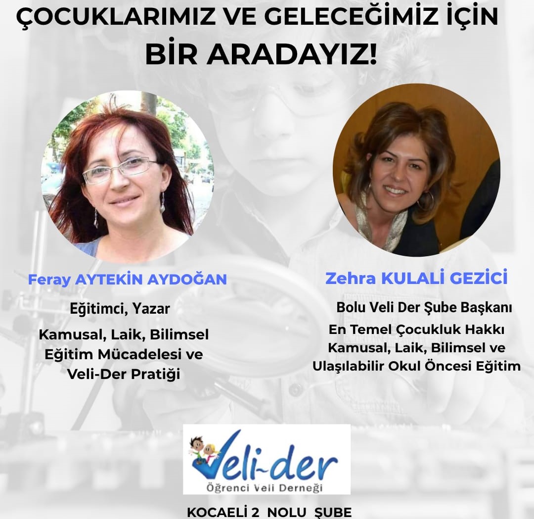 Öğrenci Veli Derneği, Veli-Der Kocaeli 2 No’lu Şube bir dönem Eğitim-Sen Genel Başkanlığı da yapan Eğitimci Yazar Feray Aytekin Aydoğan ve Veli-Der Bolu Şube Başkanı Zehra Kulalı Gezici’yi *26 Nisan Pazar günü, bilimsel ve laik eğitimi konuşacağı Derince’deki söyleşide ağırlayacak.