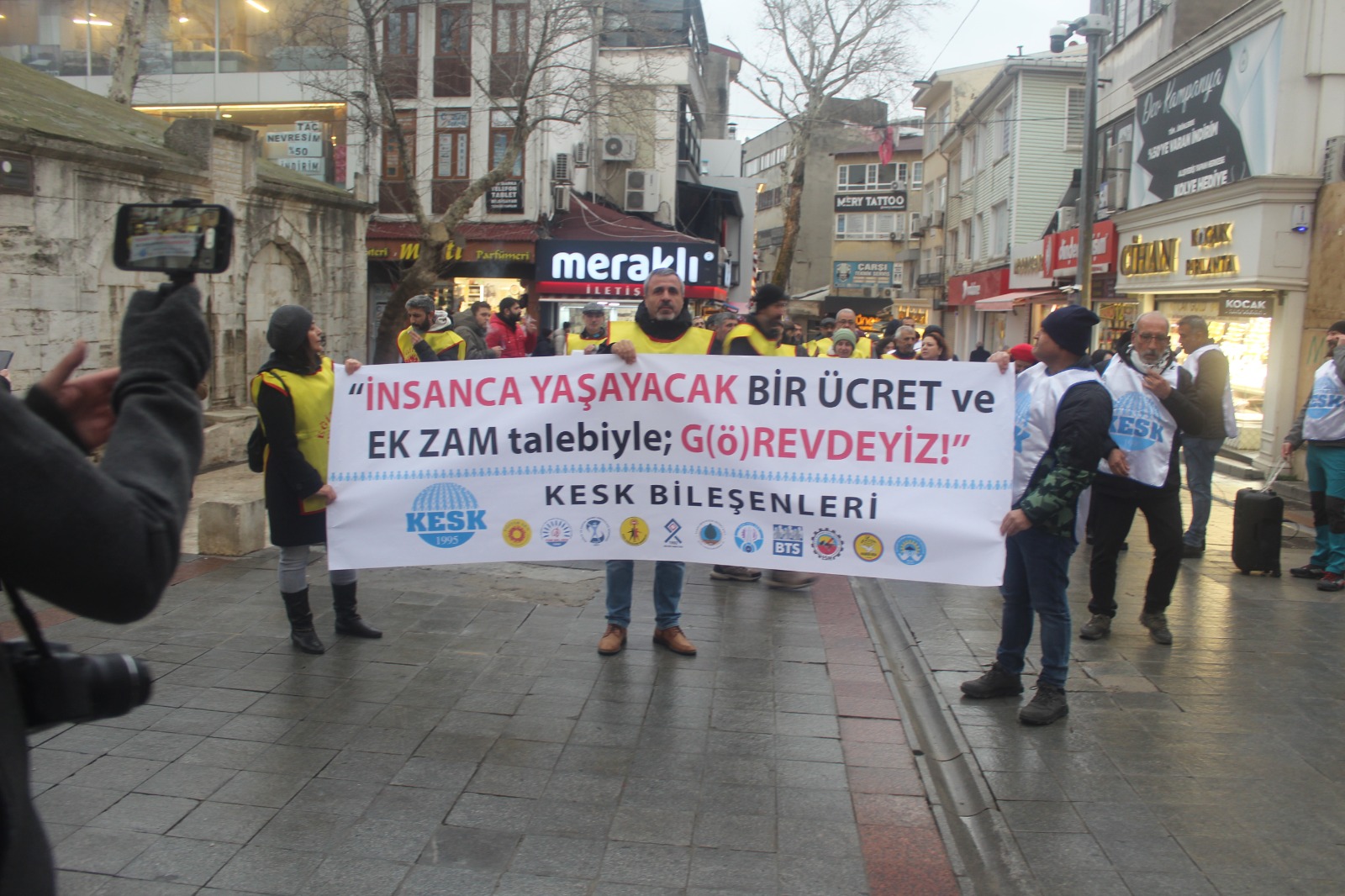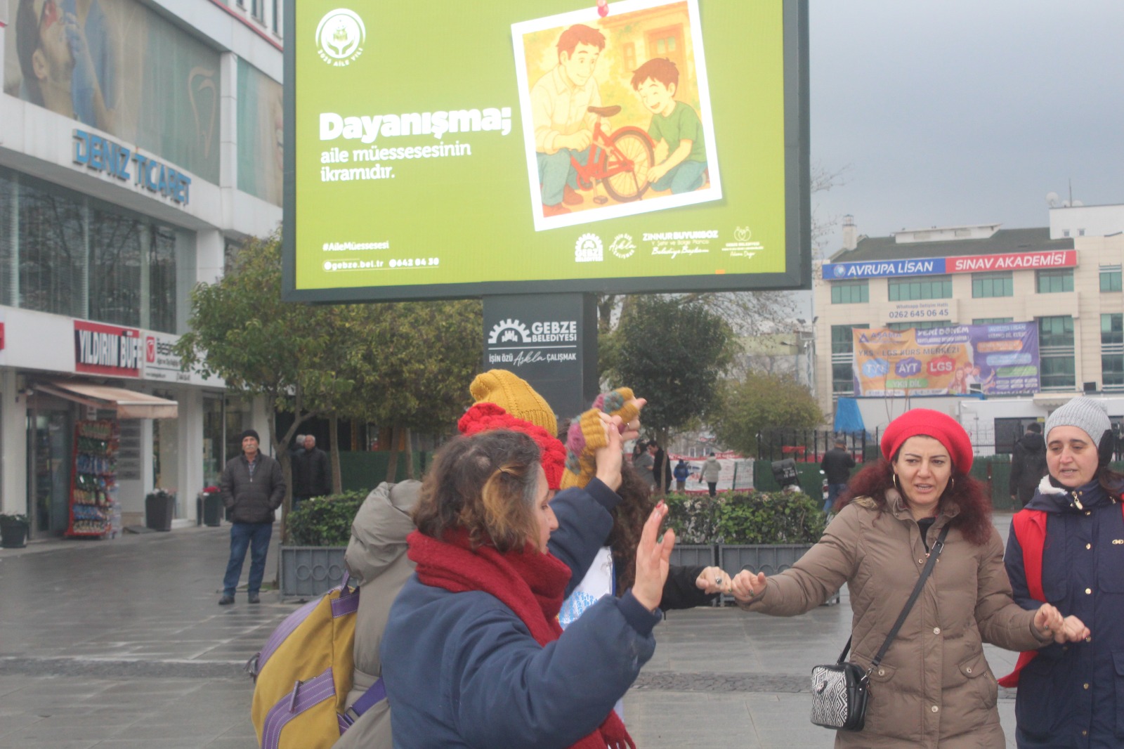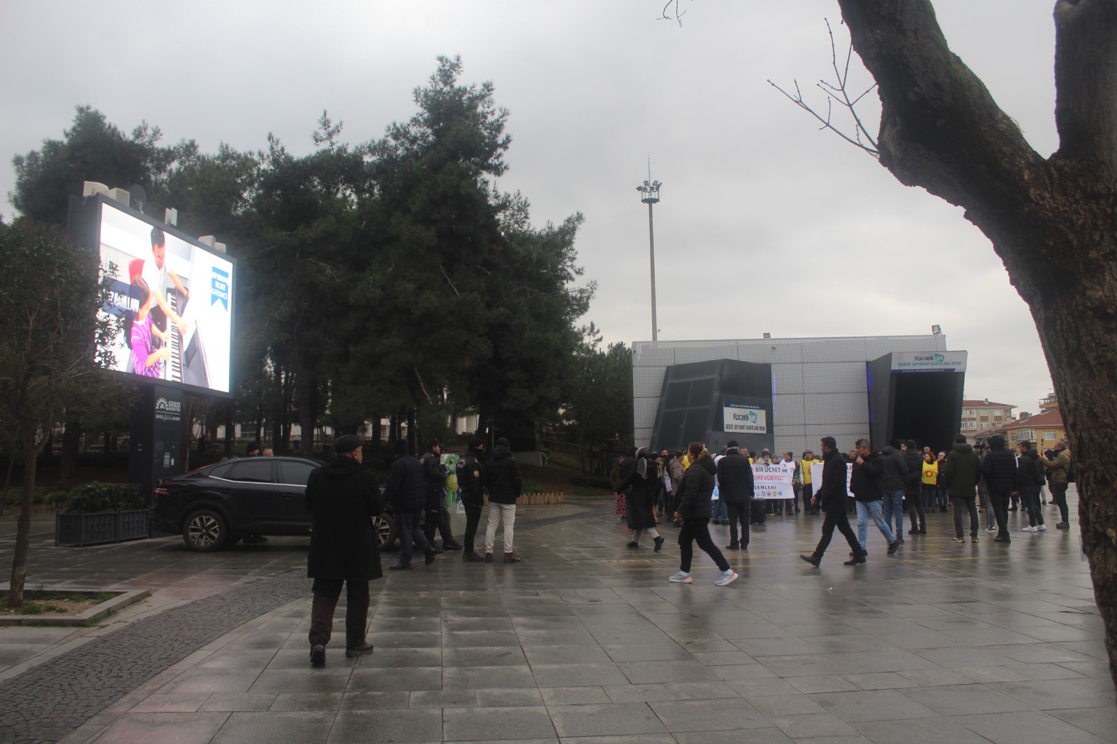 Eskiçarşı’da tarihi İbrahimağa Caddesi üzerinde toplanan kitle buradan 15 Temmuz Milli İrade Kent Meydanı’na, Eskiçarşı içinden kısa mesafeli bir yürüyüşle geldi. Basın açıklaması Eğitim-Sen Kocaeli 2 No’lu (Gebze) Şube Sekreteri Hatice Oral tarafından okundu. Kent meydanında, Gebze Belediyesi panosunda 2025 raporu reklamları bant, toplumun gerçekleri canlı “yayındaydı. Maaşlara yüzde 20 ek zam, ocak ayı için hemen şimdi istedi.