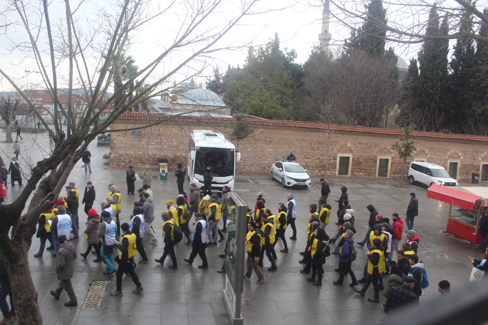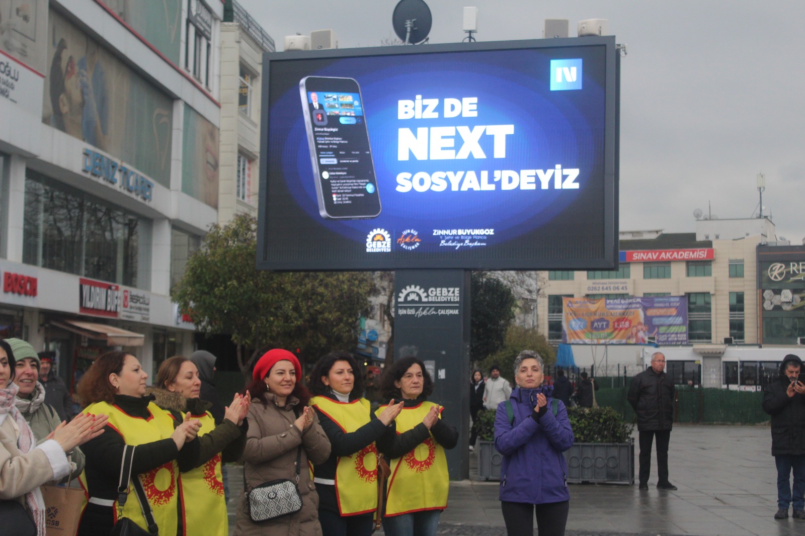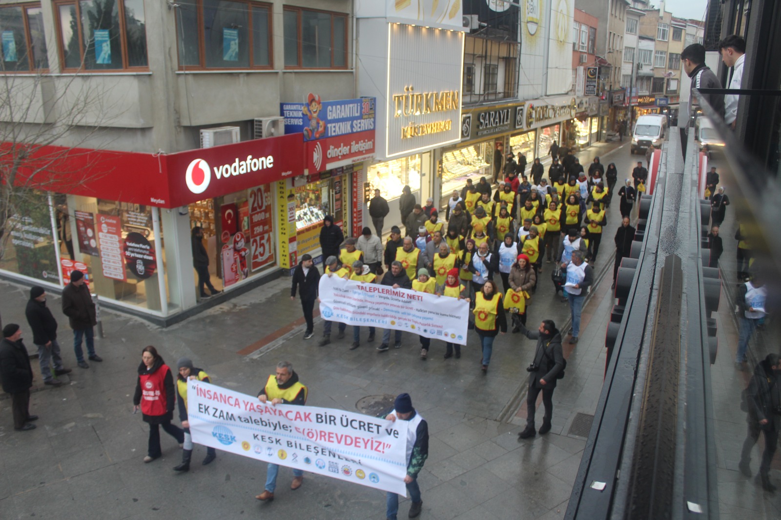 Eskiçarşı’da tarihi İbrahimağa Caddesi üzerinde toplanan kitle buradan 15 Temmuz Milli İrade Kent Meydanı’na, Eskiçarşı içinden kısa mesafeli bir yürüyüşle geldi. Basın açıklaması Eğitim-Sen Kocaeli 2 No’lu (Gebze) Şube Sekreteri Hatice Oral tarafından okundu. Kent meydanında, Gebze Belediyesi panosunda 2025 raporu reklamları bant, toplumun gerçekleri canlı “yayındaydı. Maaşlara yüzde 20 ek zam, ocak ayı için hemen şimdi istedi.