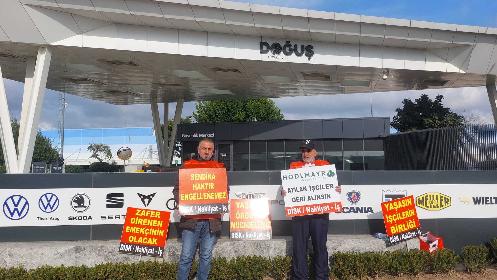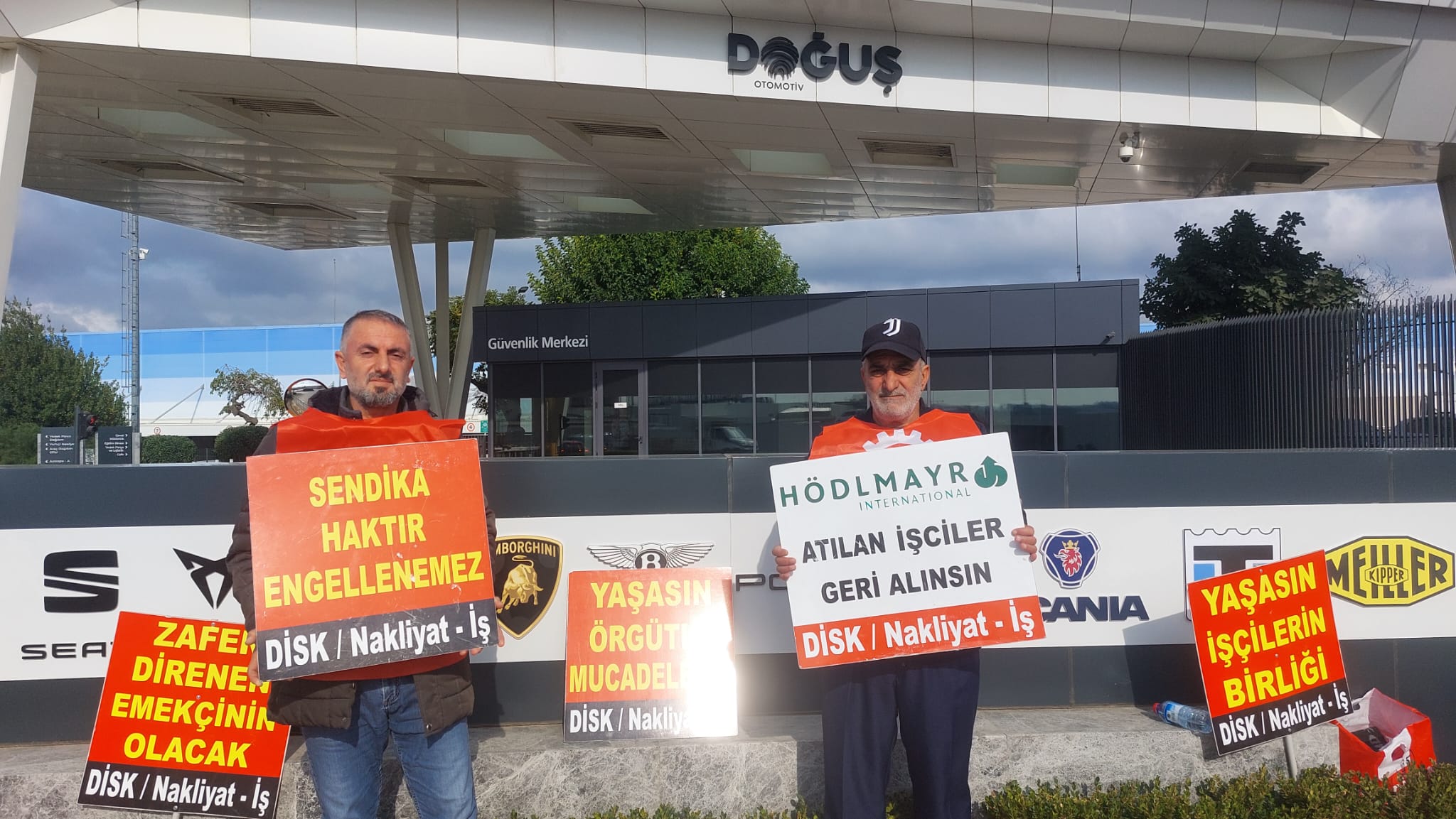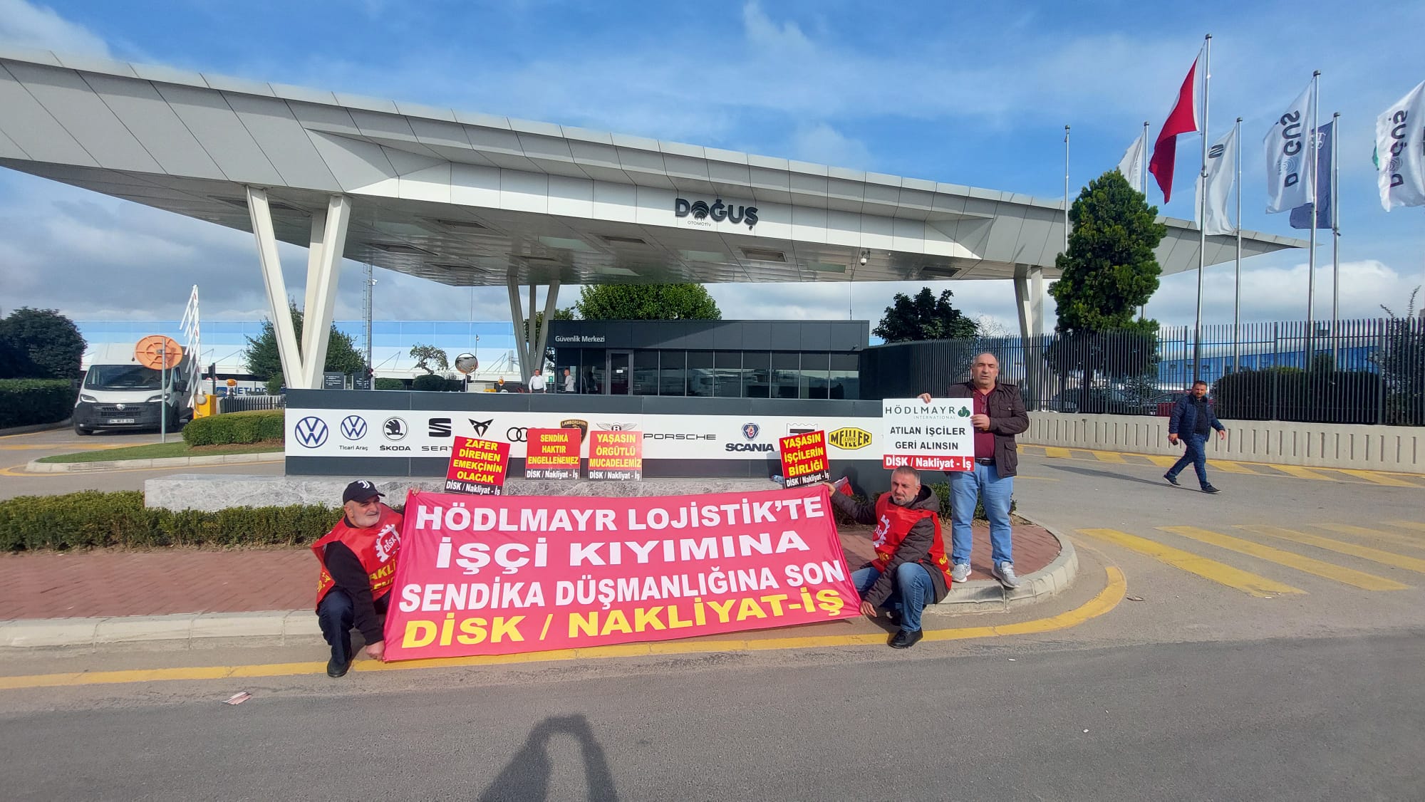 TIR şoförleri Cem Aydemir ve Mehmet Mutlu bugün itibariyle eyleme geçerken Hödlmayr Lojistik işyerinde örgütlünen DİSK Nakliyat-İş Sendikası, direnişin üçüncü gününde, 20 Ekim Pazartesi günü Volkswagen’in Türkiye distribütörü Doğuş Otomotiv’in Çayırova, Şekerpınar’daki yerinin önünde kitlesel bir eylem gerçekleştirilecek. Sendika yöneticileri, işyeri temsilci ve üyelerinin katılımı ile eylemde basın açıklaması Nakliyat-İş Sendikası Genel Başkanı Ali Rıza Küçükosmanoğlu tarafından gerçekleştirilecek.