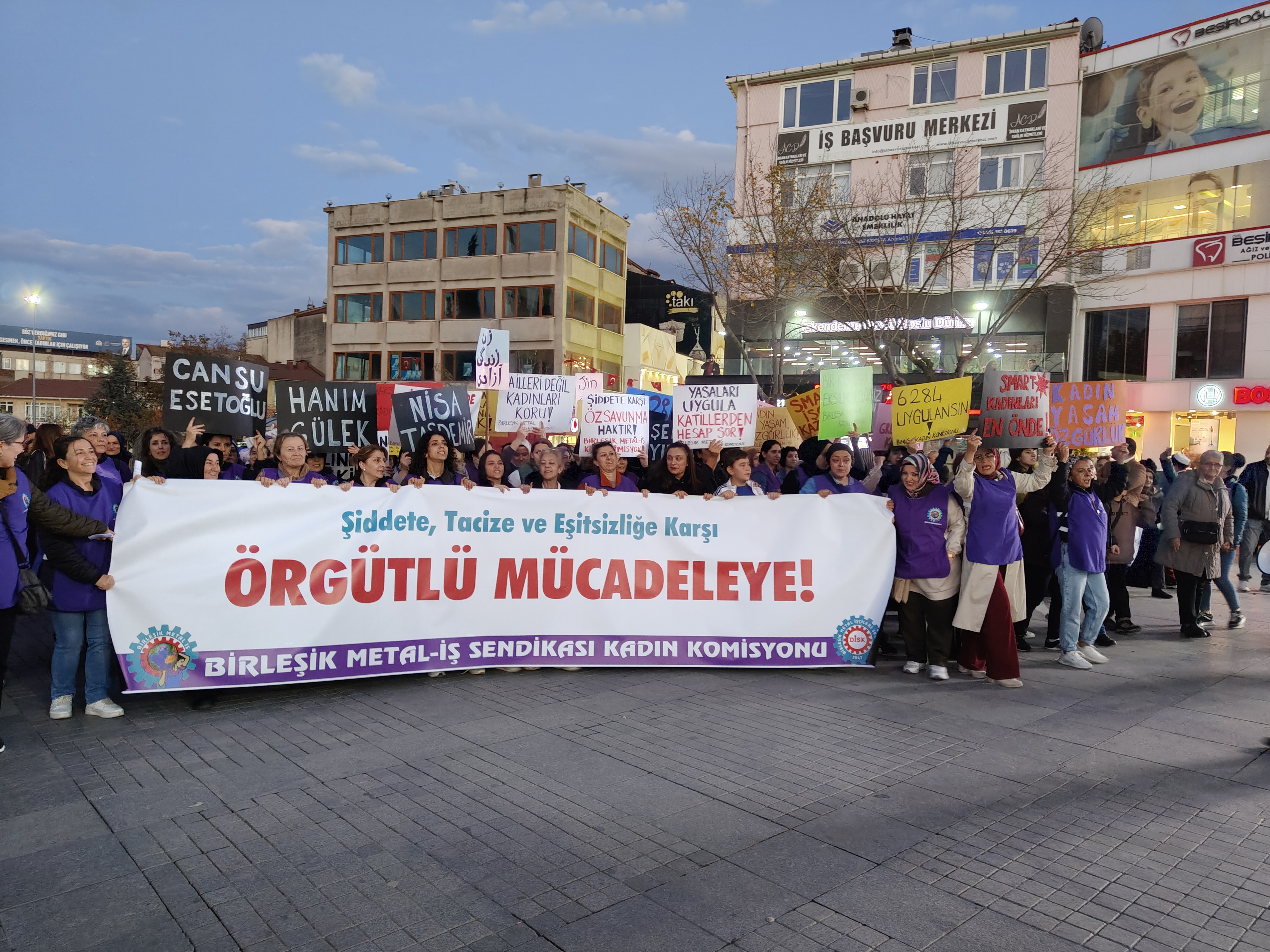 25 Kasım Kadına Yönelik Şiddete Karşı Uluslararası Mücadele Günü öncesinde Gebze'de Birleşik Metal-İş üyesi metal işçisi kadınlar taleplerini haykırdı. Metal iş kolunda Birleşik Metal-İş üyesi Gebzeli emekçilerin her yıl 25 Kasım’dan bir gün önce gerçekleşen yürüyüş ve basın açıklamasının yeni bir tekrarında slogan “Ses yükselt” oldu. Yerel yönetimlerden aydınlatılmamış sokak, genel yönetimden aydınlatılmamış cinayet bırakılmaması istendi!: