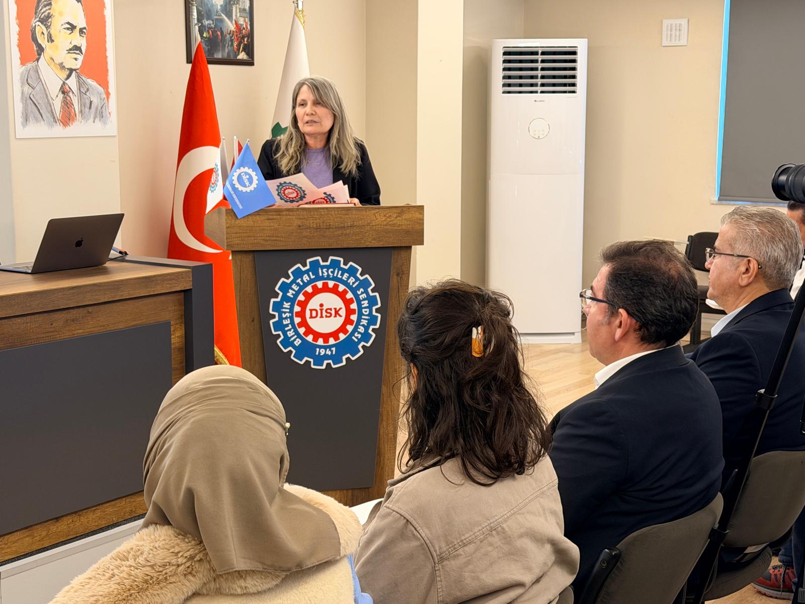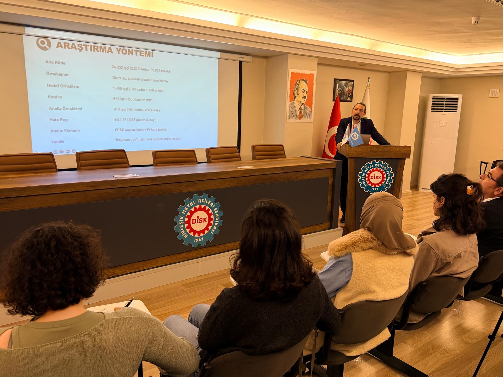 Bugün burada, sendikamızın İşçi Sağlığı ve İş Güvenliği Dairesi ile Sınıf Araştırmaları Merkezi’nin (BİSAM) gerçekleştirdiği, kişisel koruyucu donanımların toplumsal cinsiyet boyutunu ortaya çıkarmayı hedefleyen çalışmanın sonuçlarını paylaşmak üzere bir araya geldik.