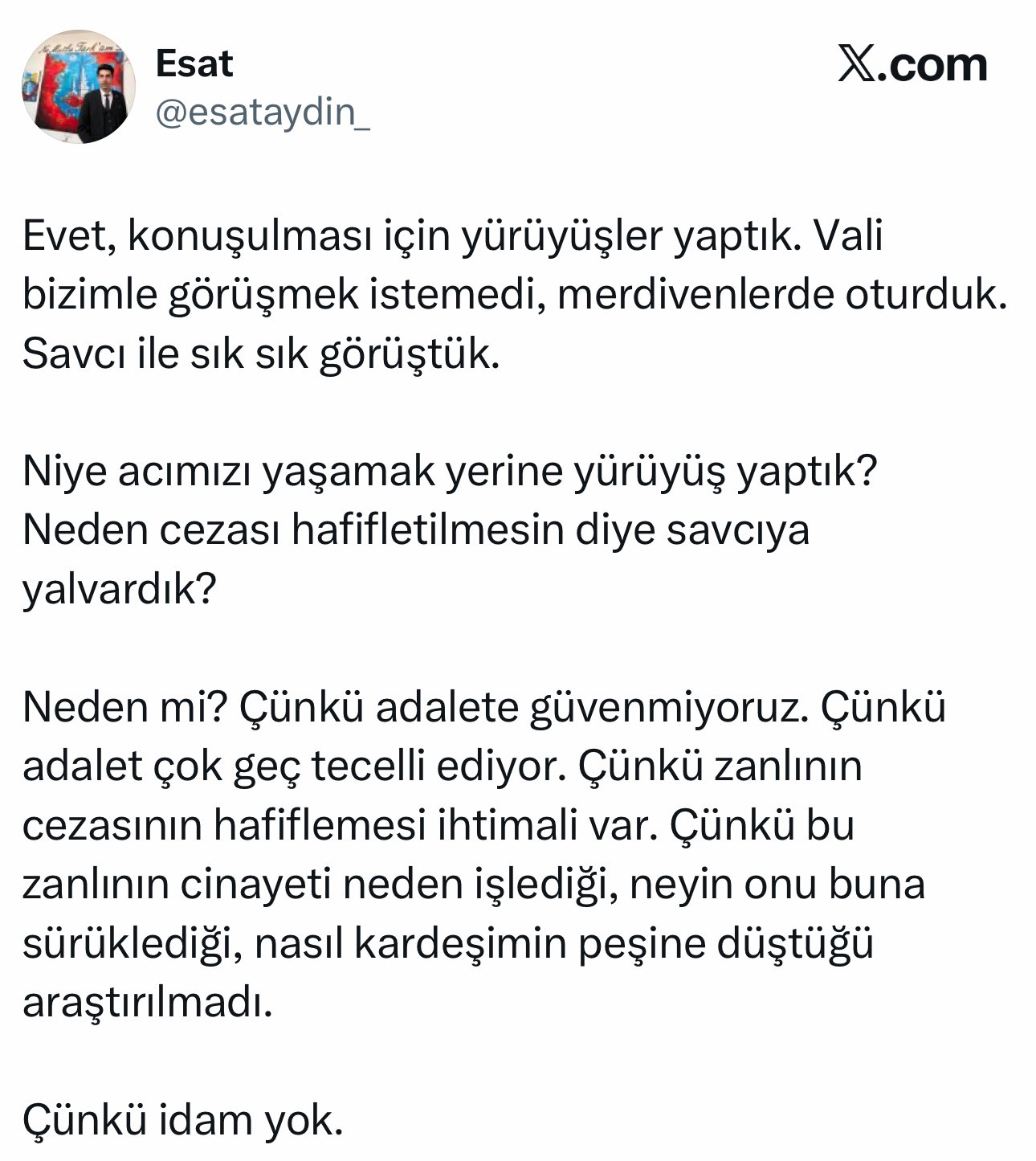 Esat Aydın, bu tarih aralığında olduğu sanılan bir sosyal medya paylaşımında şunları kaydetti: “Evet, konuşulması için yürüyüşler yaptık. Vali bizimle görüşmek istemedi, merdivenlerde oturduk. Savcı ile sık sık görüştük.