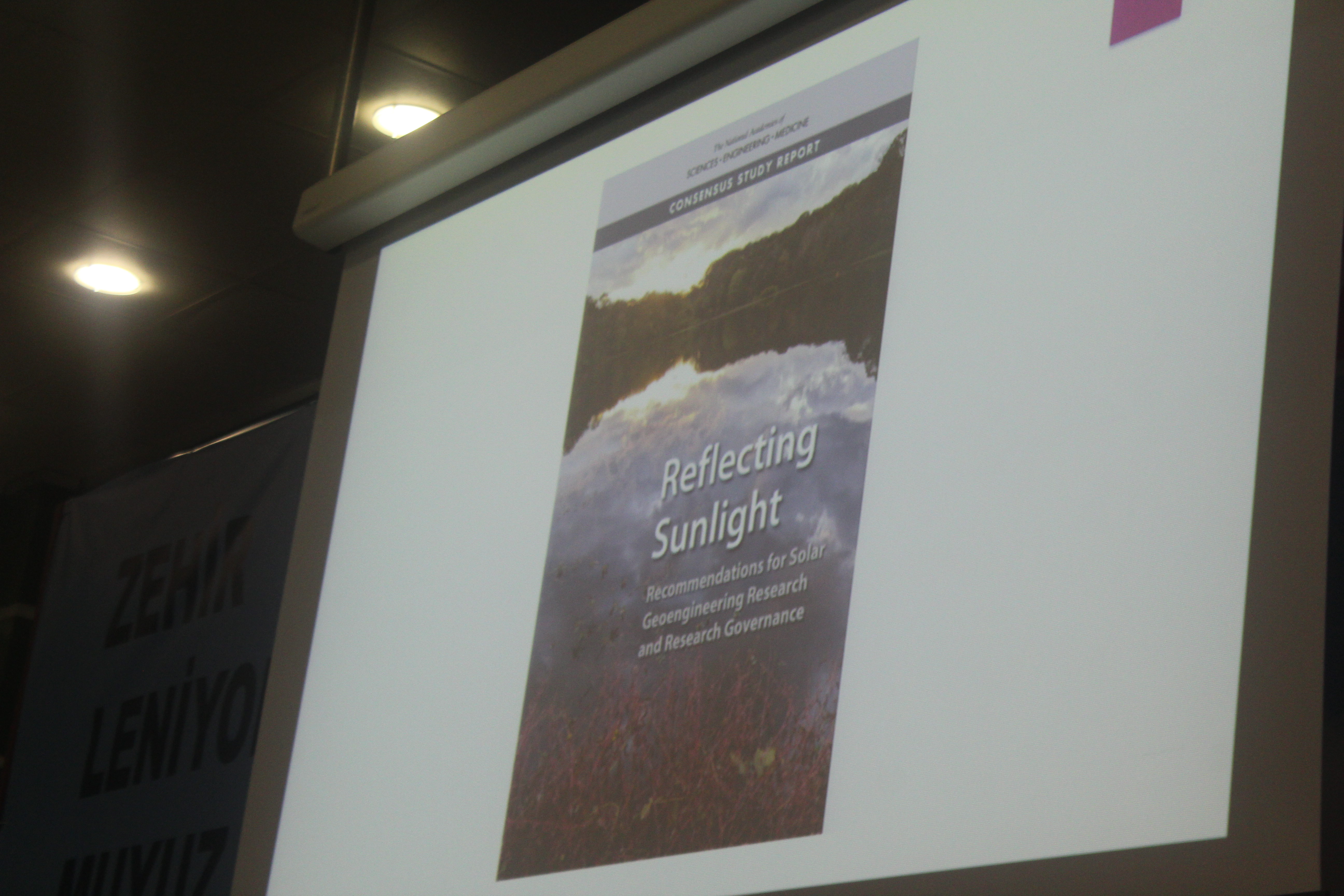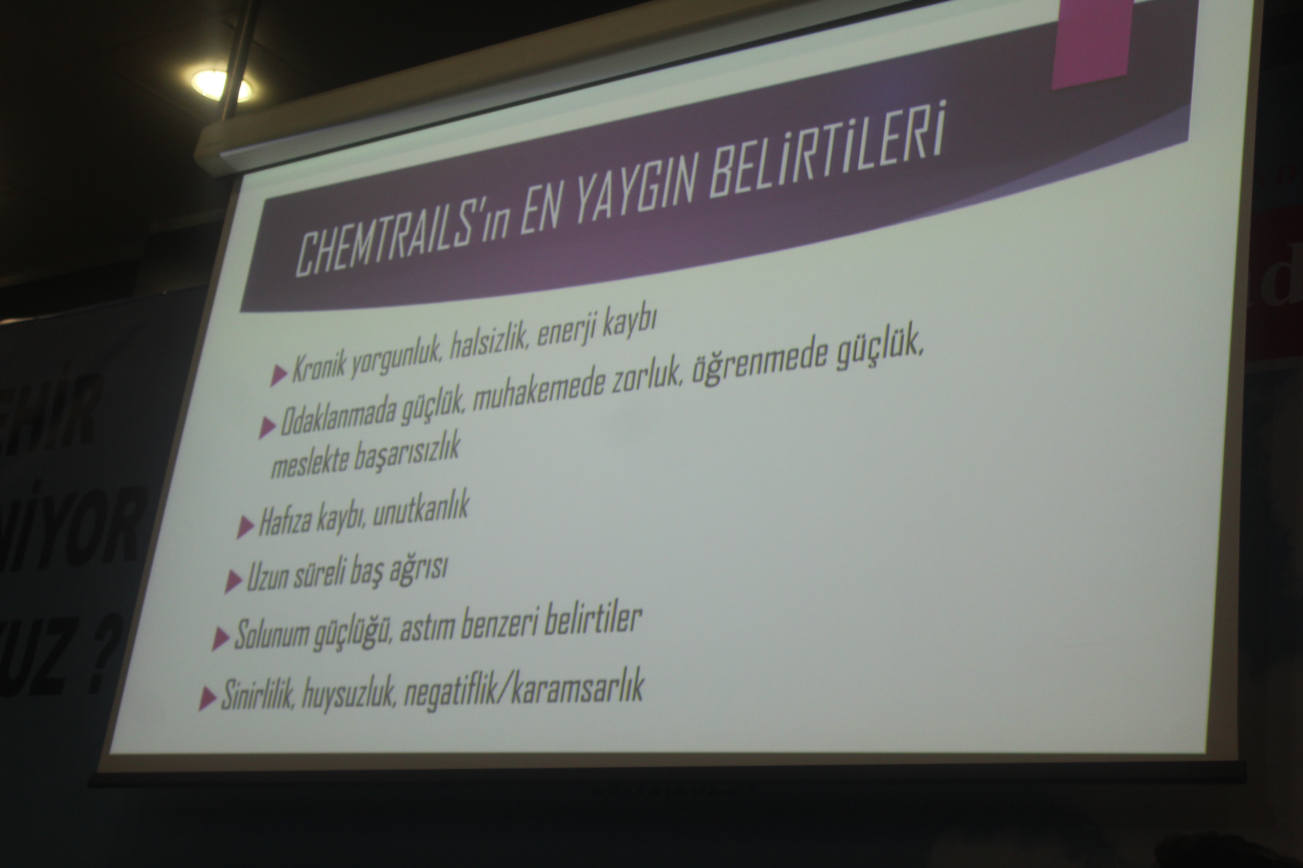 Kuyruk kısmından “Su buharı” sandığımız iz bırakan bir uçak fotosunu ekrana yansıtan Fındık, “Burada uçak izleri son derece farklı. Normalde, bir uçak geçtikten sonra izleri kaybolur çünkü su buharıdır. Ama bu uçaktan çıkan dumanlar, normal değil. Hava normal kokmuyor. İzmitliyim ve uzun yıllar İzmit’te yaşadım. Sanayiyi ve kokusunu bilirim. Siz de çok iyi bilirsiniz, hava kokuyor. Bu görüntüdeki, keşke masum olsa. Bu uçağın arkasında bıraktığı izler giderek yoğunlaşıyor ve yukarıdan aşağıya, üzerimize düşmeye başlıyor. Bu eninde sonunda hepimizi, sağlığımızı etkiliyor. İnsanoğlu nefes almadan duramaz. Havanın en üst düzeyde kaliteli, nitelikli olması lazım” dedi.
