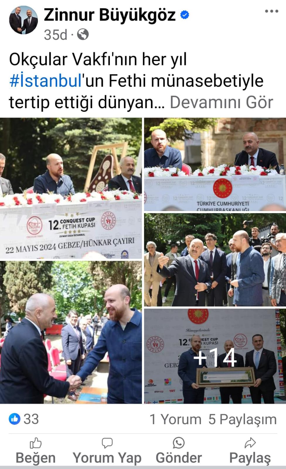 Kamuda kalmasının ardından birçok etkinliğe ev sahipliği yapan Hünkar Çayırı, 23 Mayıs’ta da Okçular Vakfı'nın her yıl İstanbul’un Fethi münasebetiyle tertip ettiği dünyanın en büyük sivil okçuluk organizasyonu olan Uluslararası Fetih Kupası'nın lansmanına ev sahipliği yaptı. Etkinliğe Cumhurbaşkanı Erdoğan’ın oğlu; Dünya Etnospor Konfederasyonu Başkanı, Okçular Vakfı Mütevelli Heyeti Üyesi Bilal Erdoğan da katıldı. Gebze Belediye Başkanı Zinnur Büyükgöz’ün Facebook sayfasından etkinlik Büyükgöz’ün “Böylesine anlamlı ve kıymetli bir organizasyonun tanıtım toplantısına ev sahipliği yapmanın mutluluğunu yaşıyoruz. Organizasyonda yarışacak tüm sporculara şimdiden başarılar diliyorum” temennisiyle paylaşıldı.