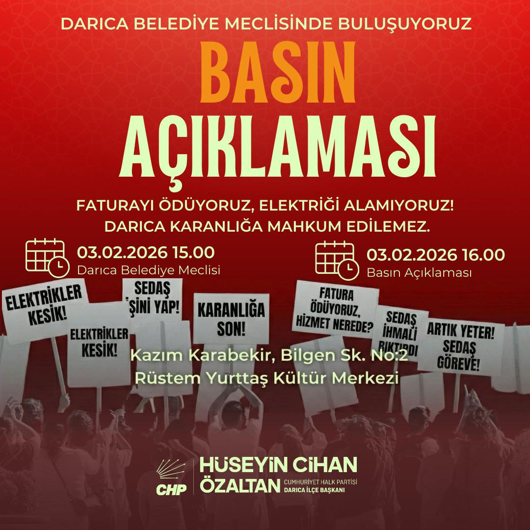 Gebze Bölgesi ilçelerinde geçtiğimiz ay yaşanan fırtına sonrası bölge genelinde çok uzun süreli elektrik kesintileri yaşanmıştı. Elektriğin yanı sıra doğalgaz kesintilerinden de sürekli yaşanan mağduriyete bugün farklı bir tepki gösterilecek. CHP Darıca İlçe Başkanı Hüseyin Cihan Özaltan ve yönetimi fırtına gecesi karanlığa gömülen ilçede mahalleleri gezmiş, Darıca Belediye Meclisi’nin bugün (03 Şubat 2026 Salı) gerçekleşecek meclis toplantısına katılım çağrısında bulunmuştu. Çağrı, CHP Darıca’nın sosyal medya hesaplarından “Faturasını Ödeyen Halk Karanlığa Mahkûm Edilemez! Hep Birlikte Hesap Sormaya Geliyoruz” başlığıyla yapılan açıklamada şu görüşlere yer verildi: