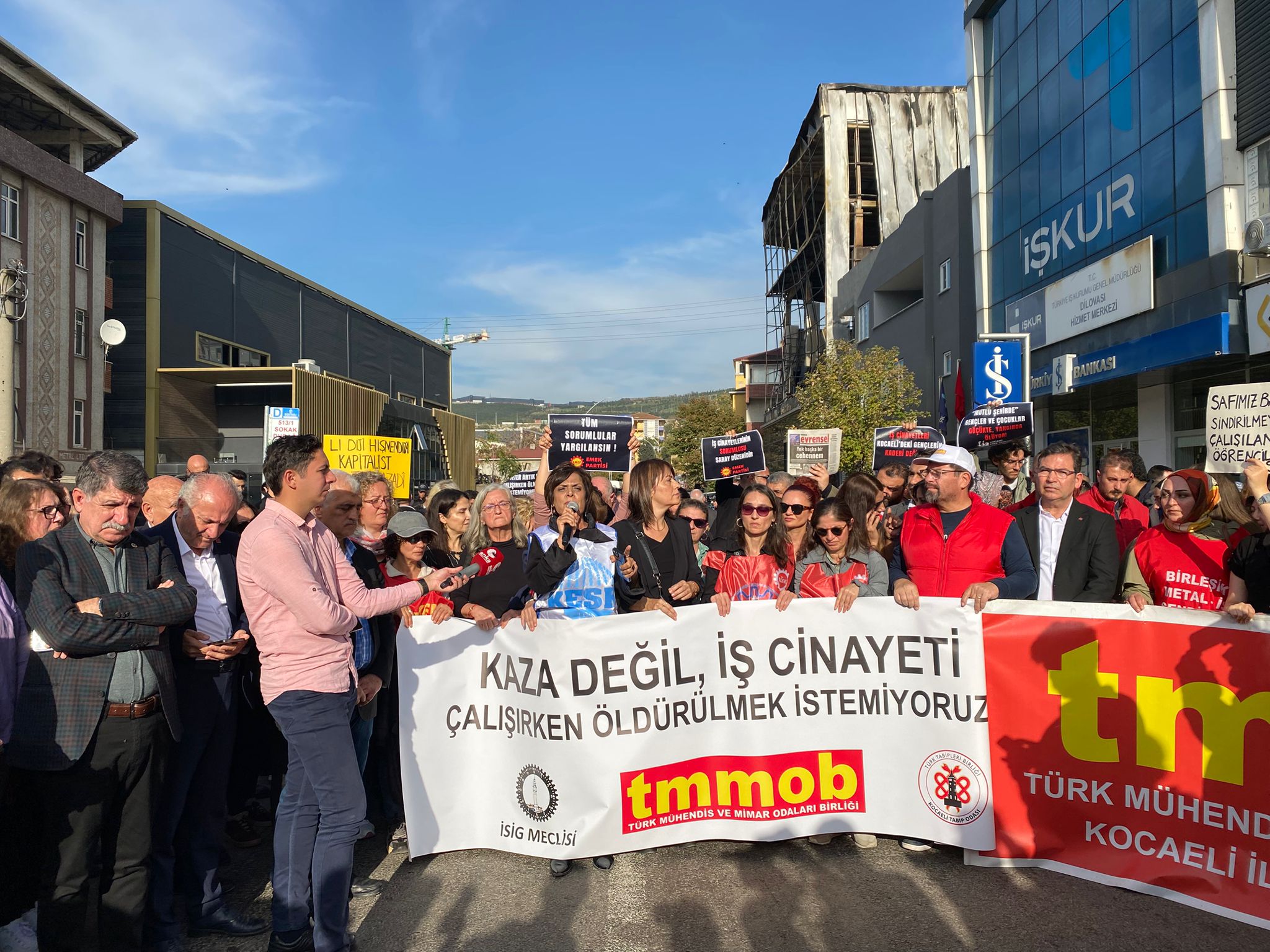 Dilovası’nda altı işçinin öldüğü faciaya dair İSİG Meclisi, TMMOB Kocaeli ve Kocaeli Tabip Odası’nın basın açıklamasında Büyükşehir ve Dilovası Belediyeleri ile iki bakanlıktan, “Konutların arasında yanıcı parlayıcı maddeler ile çalışma yapan bir işletmenin faaliyetlerine nasıl izin verilmiştir?” sorusuna da yanıt istendi. İSİG Meclisi adına Avukat Elif Yetiğin tarafından yapılan açıklamada sorular şöyle sıralandı: