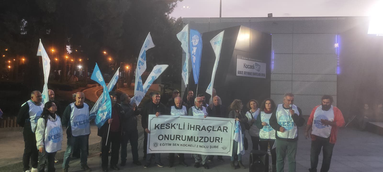 KESK’in “5 Gün, 7 Kent, Tek Ses” şiarıyla 13 Ekim’de Diyarbakır’dan başlayıp Urfa, Antep, Adıyaman, Adana, Mersin güzergahları üzerinden dün Ankara’da sonlanan yürüyüşle ilgili olarak Eğitim-Sen Kocaeli 2 Nolu (Gebze) Şube, 15 Temmuz Milli İrade Kent Meydanı’nda basın açıklaması yaptı. Basın açıklamasına Eğitim-Sen Kocaeli 2 No’lu Şube Başkanı Sinan Kaya, şube yönetici ve üyelerinin yanı sıra EMEP Gebze Şube Başkanı Yusuf Akar, CHP Çayırova İlçe Sekreteri emekli öğretmen Fikri Çelik, MMO Gebze İlçe Temsilciliği Başkanı Tanfer Yeşiltepe, DEM Parti Gebze İlçe eski Başkanı Kasım Karayaka da katılarak destek verdi.