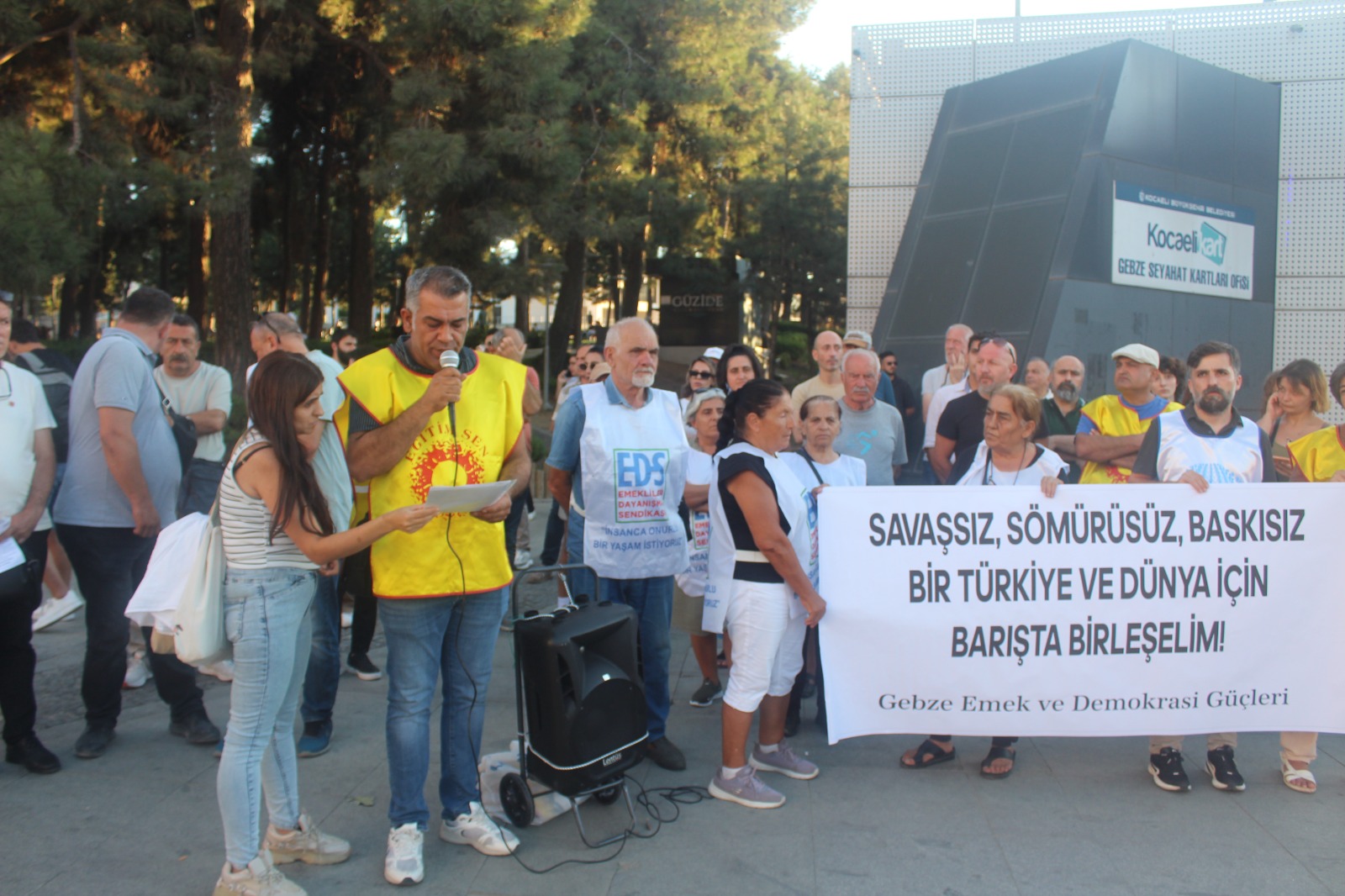 Gebze Emek ve Demokrasi Güçleri, 1 Eylül Dünya Barış Günü’nde bu sefer günün anlamıyla ilişkili, barış temasıyla, Gebze 15 Temmuz Milli İrade Kent Meydanı’ndaydı. Eğitim-Sen Kocaeli 2 No’lu Şube Başkanı Sinan Kaya tarafından okunan basın açıklamasında İktidarın Suriye’de faşist rejimi destekten vazgeçmesi istendi. Kürt meselesinde gelinen aşamanın kıymetli olduğu belirtilip, “Daha fazla ertelenemez” denildi: