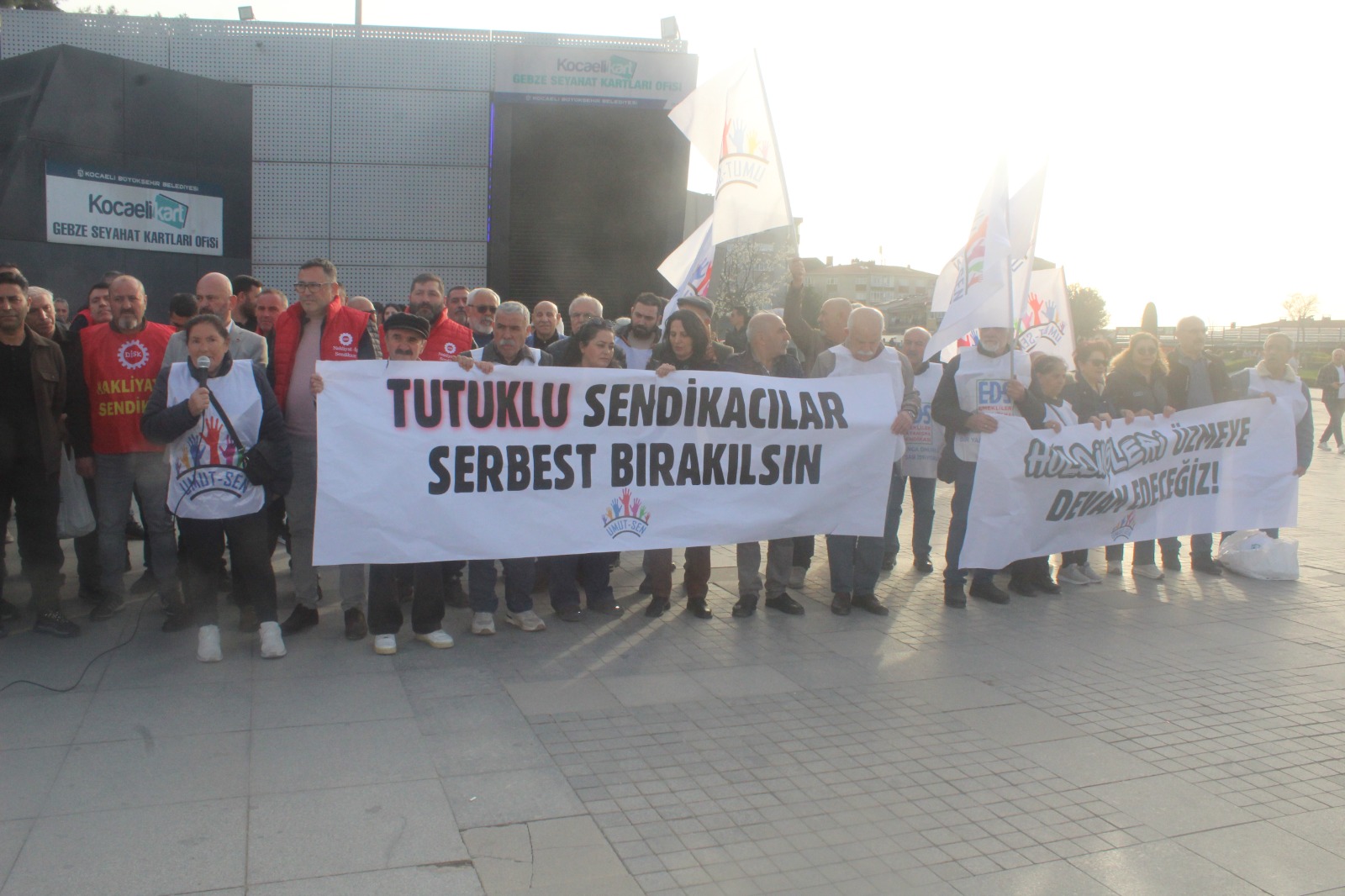 Ülkemizde rejimin son zamanlarda artırdığı baskı ve tutuklamalara karşı Umut-Sen’in Gebze’deki basın açıklamasına beş sendika, ikişer parti ve iki STÖ destek verdi. Kadaifçi, “Dayanışma ve mücadeleyi büyütecek, ülkeyi holdinglere teslim etmeyeceğiz” dedi