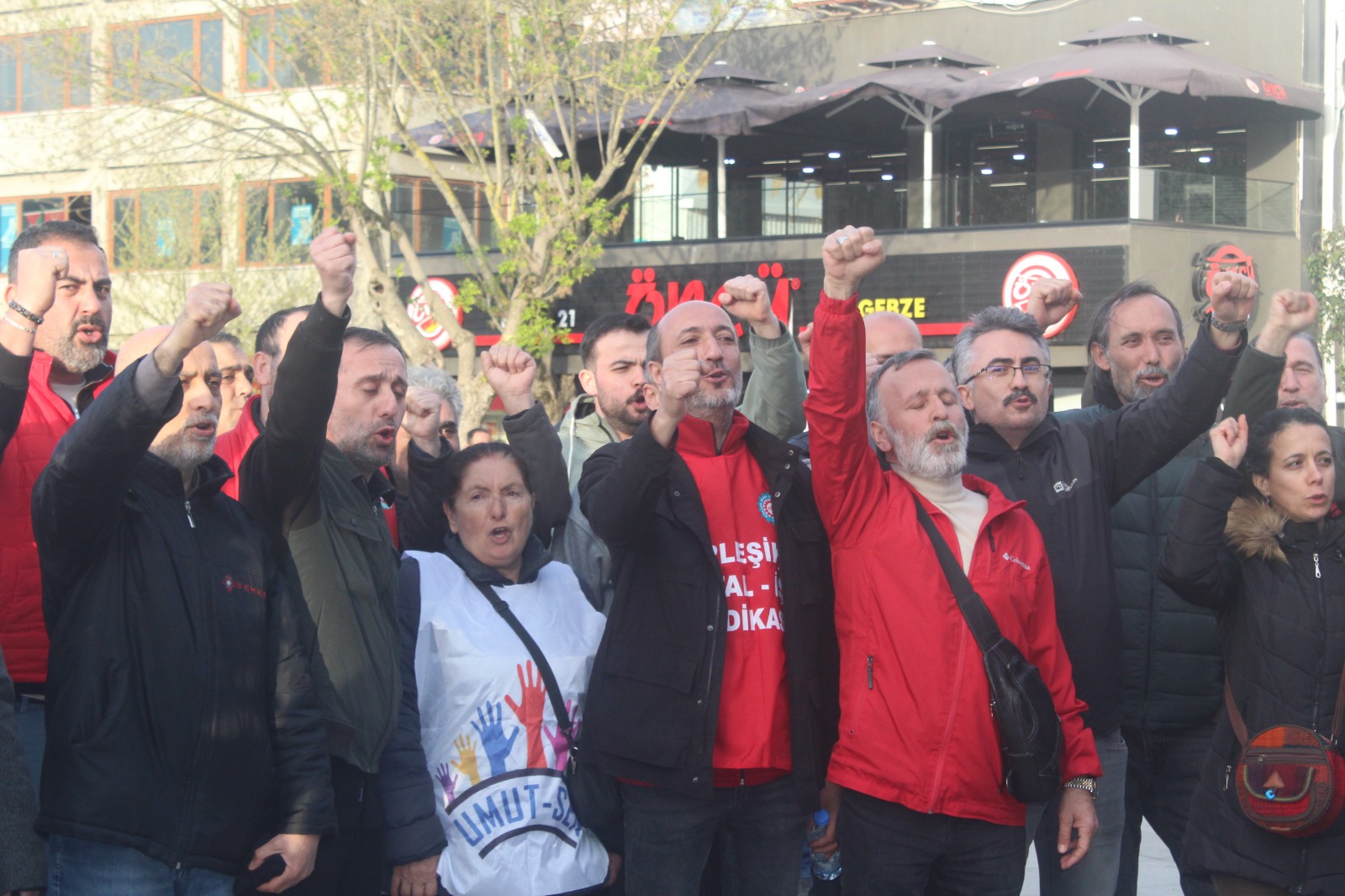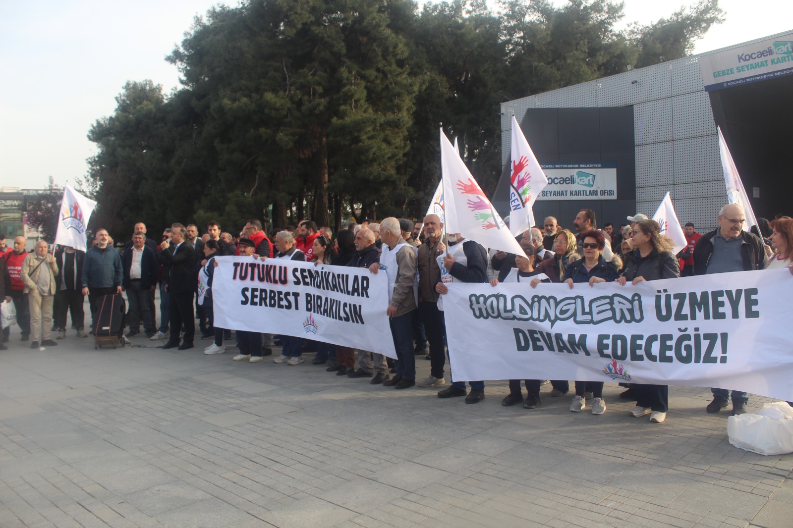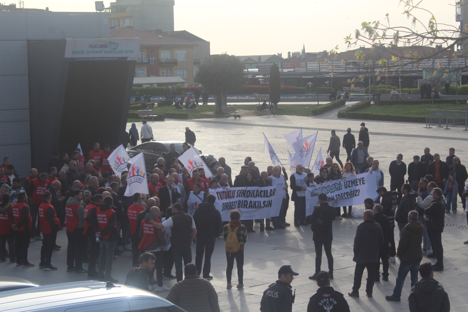 “Başaran Aksu yalnız değildir”, “Mehmet Türkmen yalnız değildir”, “Gözaltılar, tutuklamalar, baskılar bizi yıldıramaz”, “Kurtuluş yok tek başına ya hep beraber ya hiç birimiz”, “Kahrolsun sarı sendikacılık”, “Kamber Saygılı yalnız değildir”, “Sendikal faaliyetler engellenemez”, “Patronların kölesi olmayacağız”, “Birleşe birleşe kazanacağız” sloganlarının atıldığı;