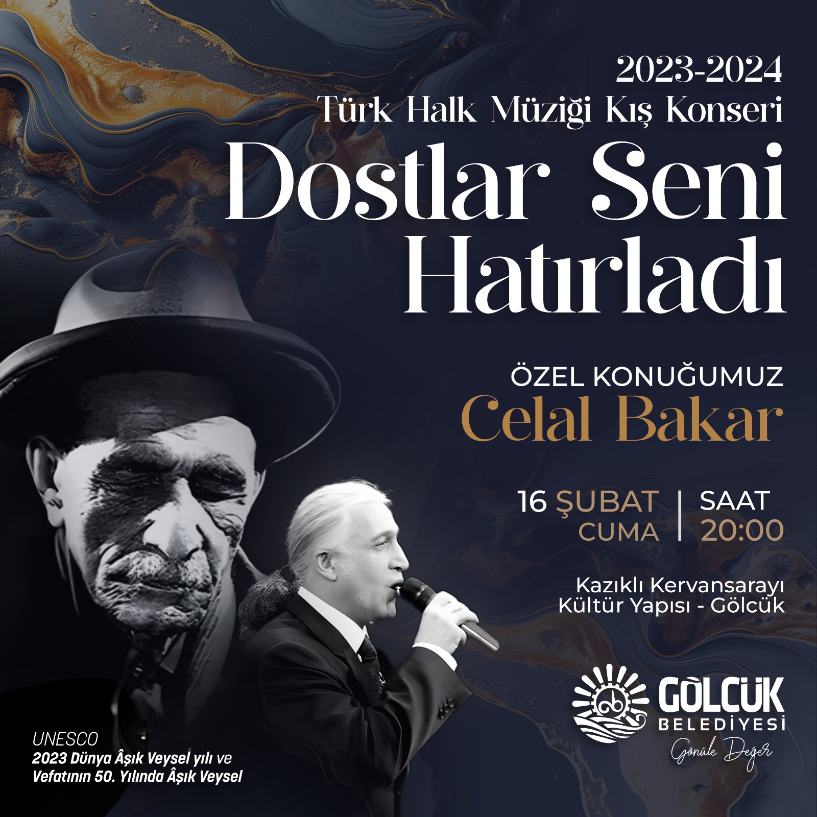 Kazıklı Kervansarayı Kültür Yapısı’nda düzenlenecek Âşık Veysel’i Anma Konseri, 16 Şubat Cuma günü saat 20.00’de başlayacak. Gölcük Belediye Başkanı Ali Yıldırım Sezer, Âşık Veysel’in en güzel türkülerinin seslendirileceği konsere tüm hemşehrilerini davetli olduğu söyledi.