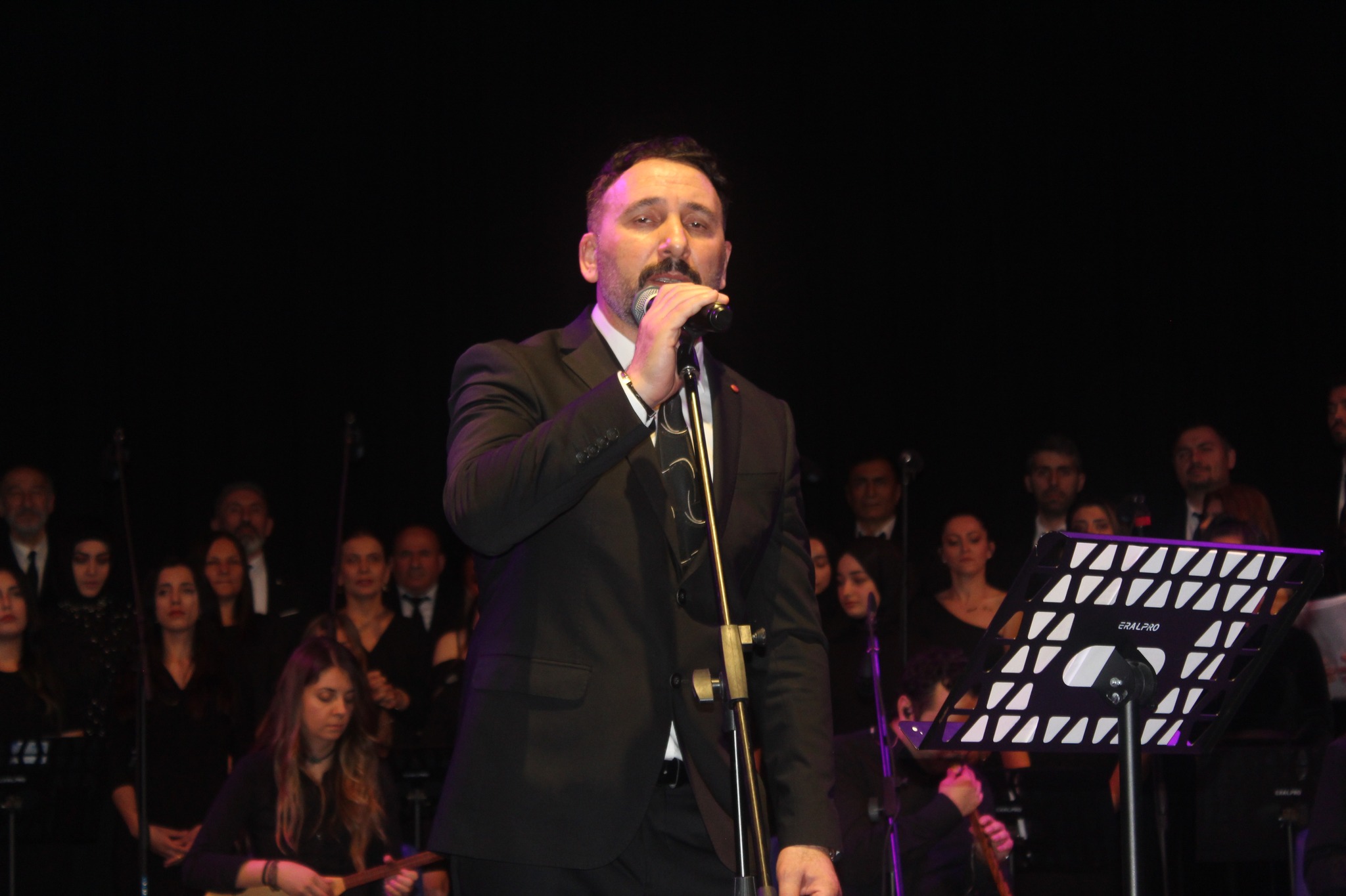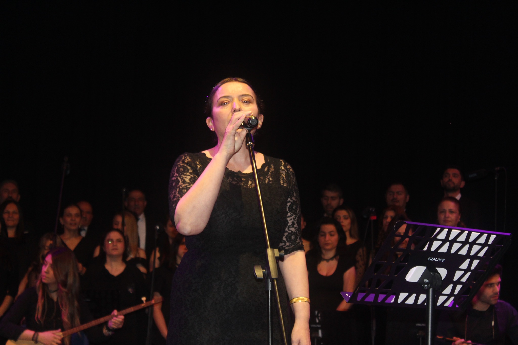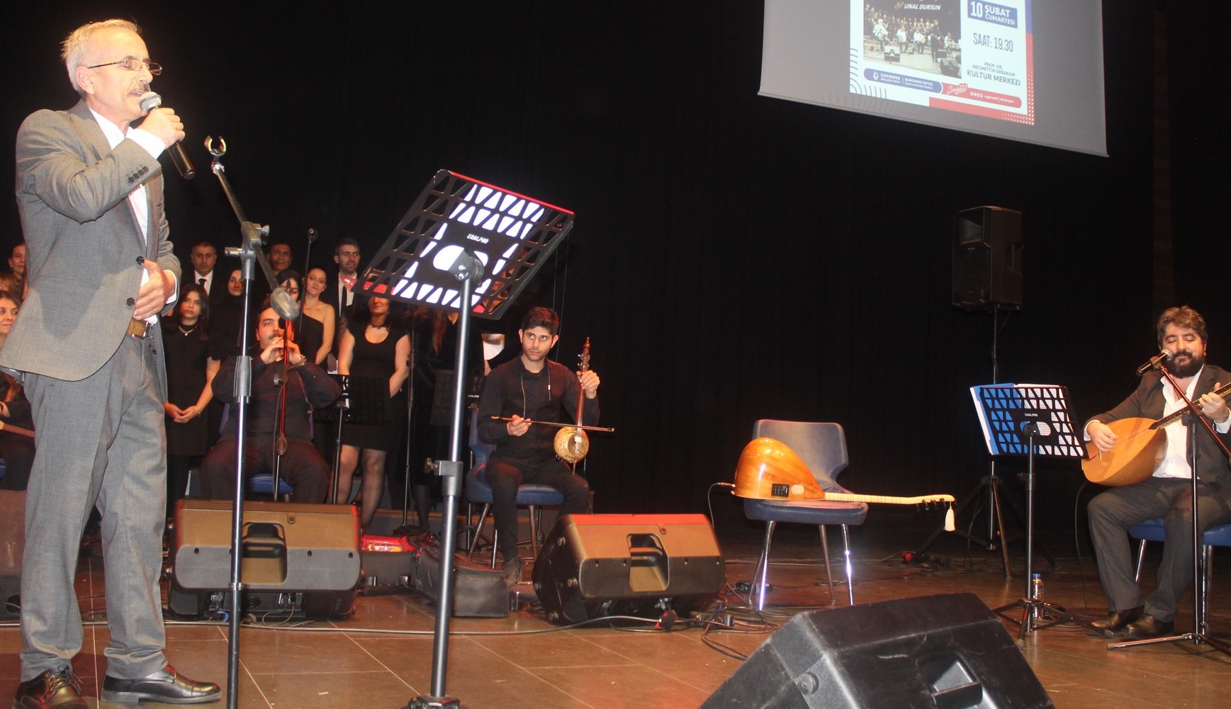 Ünal Dursun saz ekibini, koristleri ve koroda yer almalarına destek oldukları eşlerini, konseri izleyenlere alkışlattı.