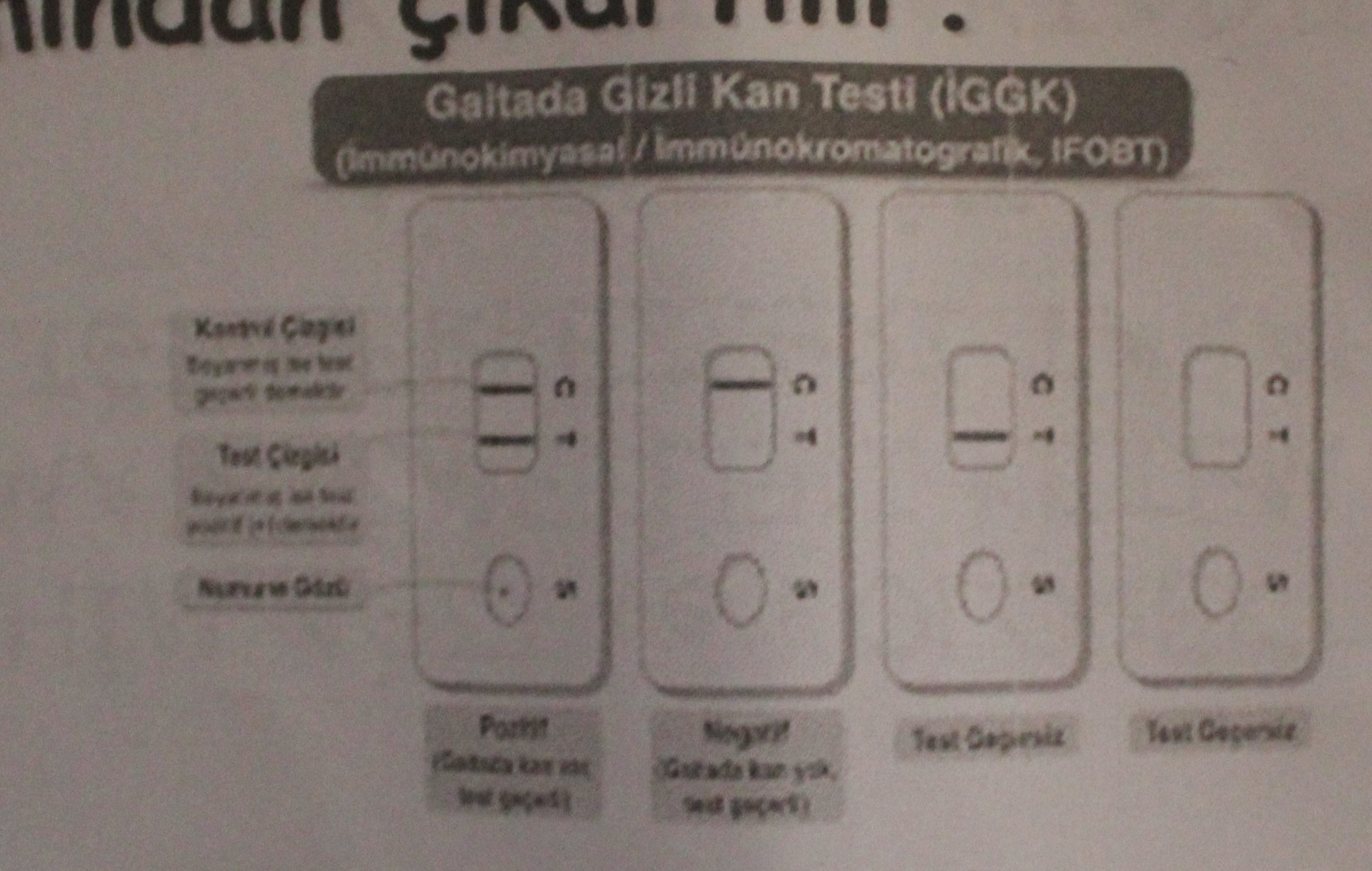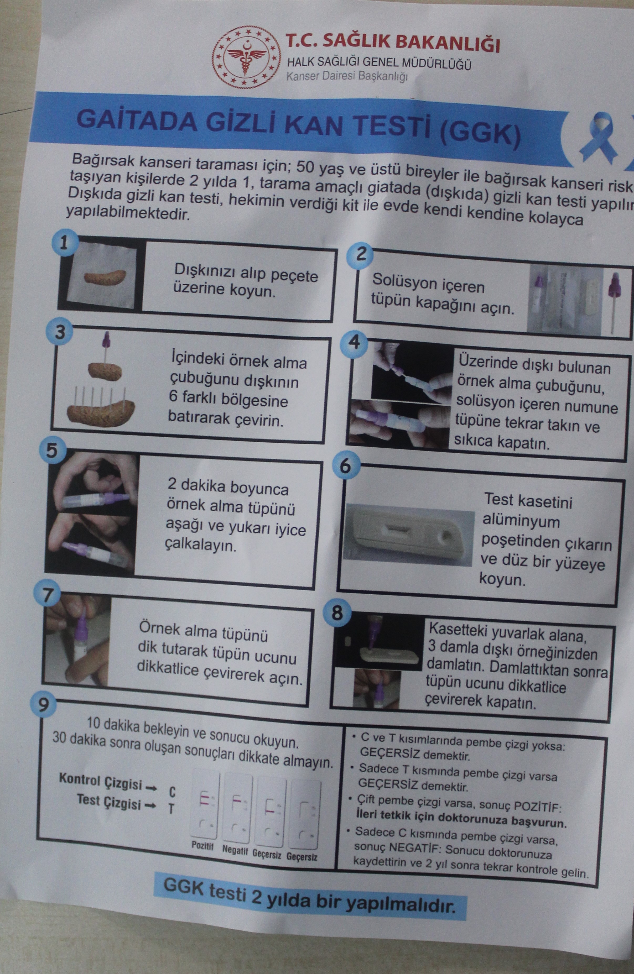 Aile hekiminizden gaita testi kiti alın. Size verilen pembe kaba, tuvalette dışkı örneği alın. Gaita testi kitini açın. Size verilen mavi renkli şişenin kapağını açın. Çubuk kısmına gaita kitindeki gaita üç ayrı yerine batırıp çıkartın. Çubuğu tekrar şişeye koyun. Şişeyi ters çevirin. Şişenin kapağını kırıp kaset üzerine üç damla damlatın. Çift veya tek çizgi olduğunu aile hekiminize söyleyin.