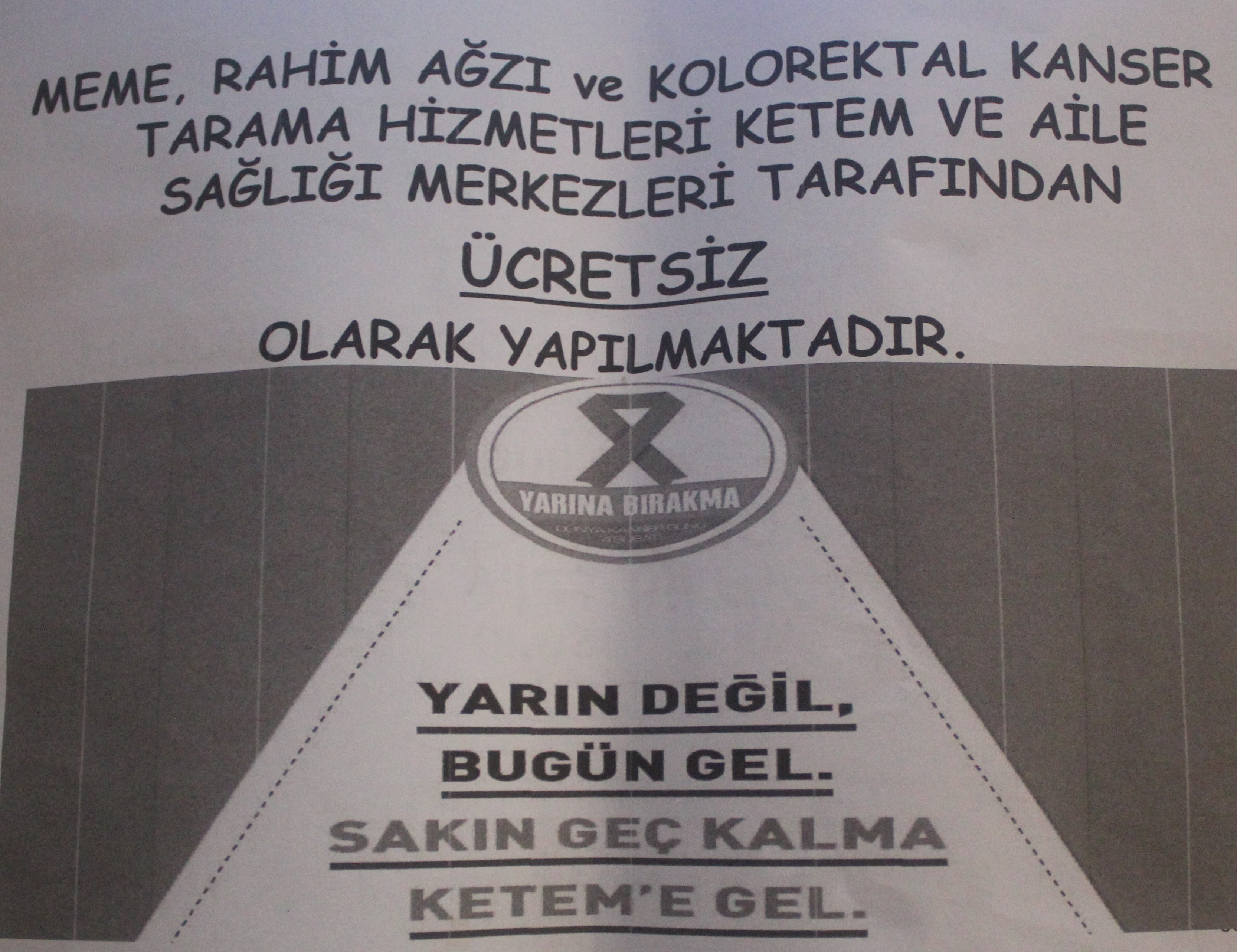Meme, rahim ağzı ve kolorektal kanser tarama hizmetleri KETEM ve aile sağlığı merkezleri tarafından ücretsiz olarak yapılmaktadır.