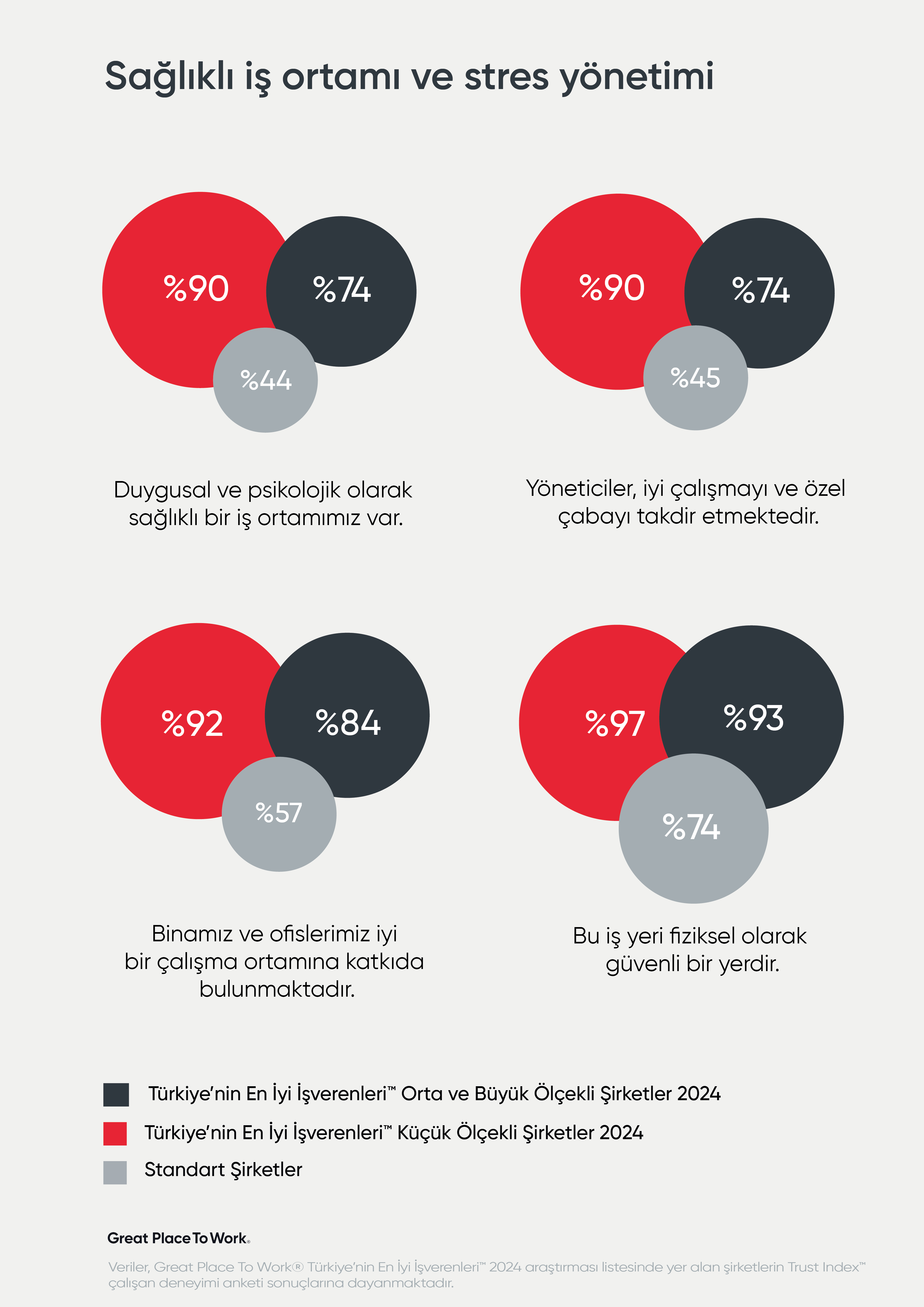 Raporda, stres yönetimi ve inovasyona odaklanan şirketlerdeki çalışanların, daha yüksek motivasyon ve bağlılık oranına sahip olduğu göze çarpıyor. Çalışanların zihinsel ve duygusal refahını desteklemenin, eğitim ve etkinliklerle gelişim fırsatları sunmanın, yeni fikirlere açık bir ortam yaratmanın önemini vurgulayan rapor, bu konuların çalışanların organizasyonlarını çalışmak için harika bir iş yeri olarak değerlendirirken, yüksek maaş oranlarına dahip bir iş yerinin çalışmak için en iyi iş yeri olduğu var sayımının önüne geçtğini -gösteriyor.