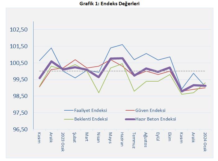 Söz konusu endekslerin oluşturulmasına esas teşkil eden anket ile firmalara 8 soru soruluyor. Her bir endeksin değeri 100’ün altında ya da üstünde olmasına bağlı olarak yorumlanıyor. 100’ün üzerinde olması durumunda önceki aya ait faaliyetin ya da gelecek döneme ilişkin beklentinin olumlu yönde geliştiği yorumu yapılıyor. Türkiye genelinde her ay hazır beton üreticileri ile gerçekleştirilen çalışmada 3 farklı endeks oluşturuluyor. Hazır Beton Faaliyet Endeksi ile hazır beton firmalarının geçmiş bir aylık faaliyetlerinin sonuçları, Hazır Beton Güven Endeksi ile hazır beton sektöründe faaliyet gösteren teşebbüslerin, ekonomi ve sektöre yönelik duydukları güven seviyesi, Hazır Beton Beklenti Endeksi ile hazır beton firmalarının önümüzdeki üç aylık dönemde faaliyetlerinin hangi seviyede olacağına ilişkin beklentiler hakkında bilgi ediniliyor. Hazır Beton Endeksi ile endekslerin tümünü içeren bileşik endeks elde ediliyor.