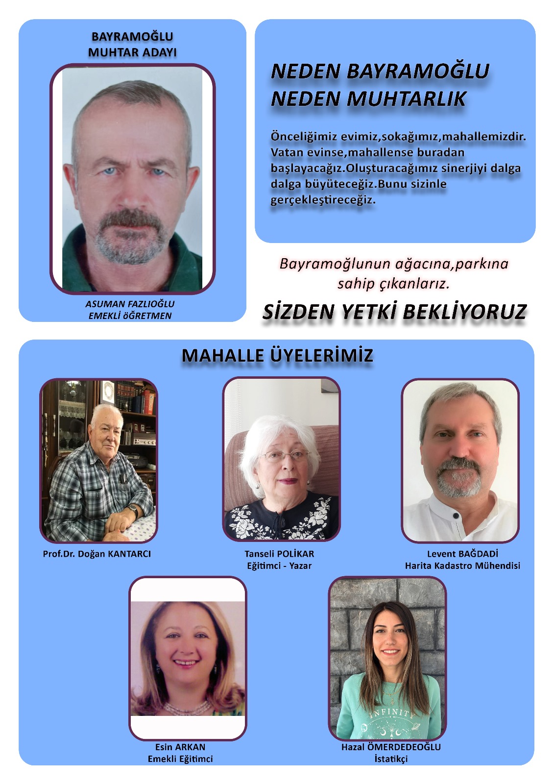 Meclis (aza) adaylarımız Bayramoğlu’nda insana, doğaya ve çevresine saygılı, hedeflerimizin fazlası bir yaşam standardı için mücadele edecek kişilerden oluştu. Kendi alanlarında ihtisas sahibi, Bayramoğlu’nu ileriye taşıyacak yetenekte kişilerdir. Bizler insanı merkeze alan, sosyal ve siyasi ilişkileri güçlü ve çözüm odaklı bir ekiple yola çıkıyoruz.”