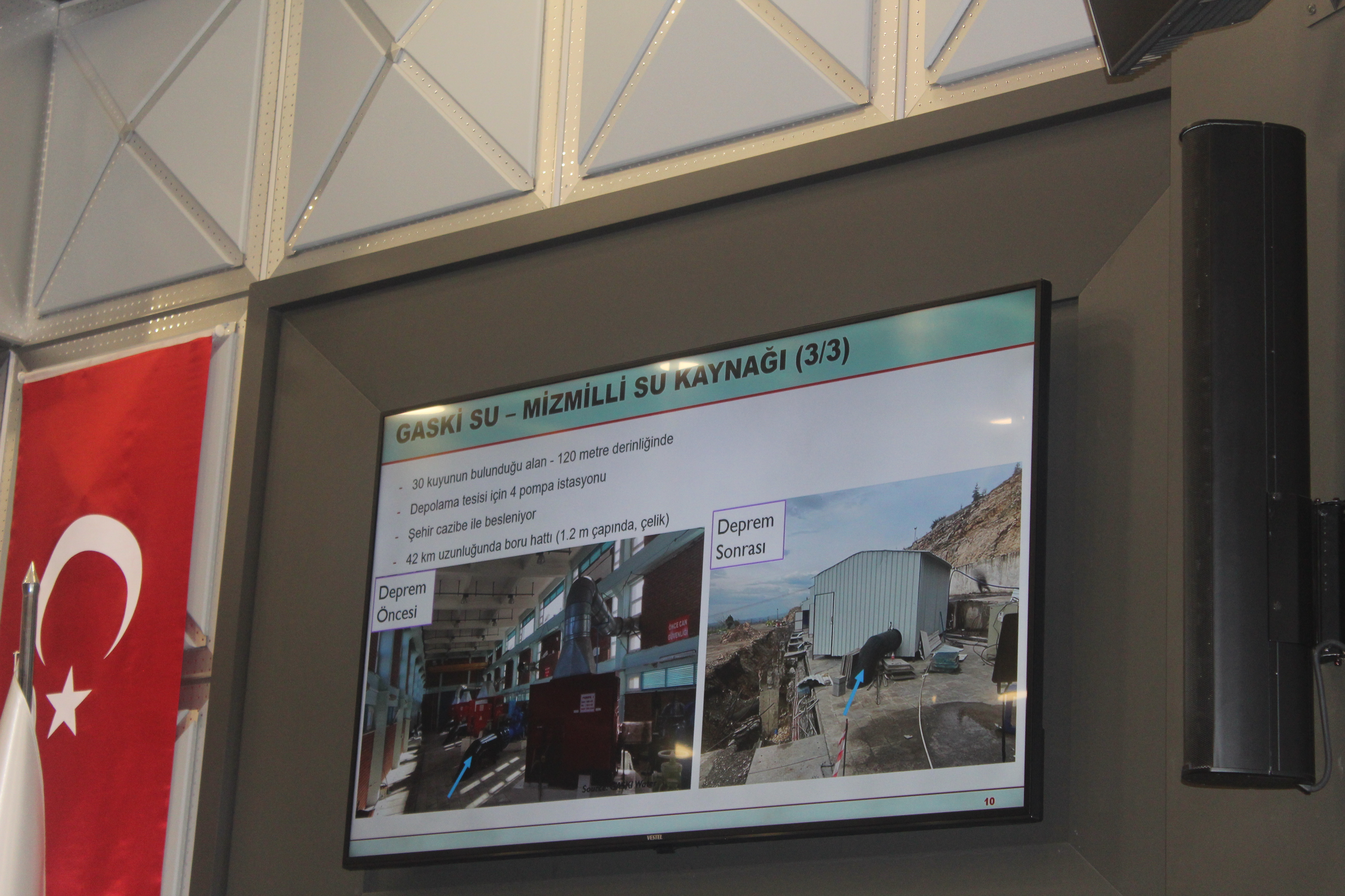 Hattın kendisi ile birlikte hattı muhafaza eden üstyapıların da önemine işaret eden Toprak, bir tünelin içine alınan 2.6 metre çapındaki su borusu hattını ve emsallerini de gösterdi. Kimi altyapıların deprem öncesi ve sonrası hallerini yine fotoğraf kareleri üzerinden gösterip anlatan Toprak, “Fay hatları gömülü sistemlerde bir sorun. Öte yandan zemindeki sıvılaşma ve heyelanlar da önemli sorunlardan” dedi.