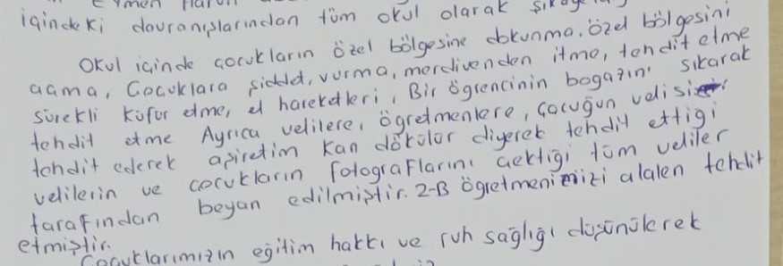 Ayrıca öğretmenleri, velileri çocuğun velisinin, ‘Aşiretim kan dökülür’ diyerek tehdit ettiği, velilerin ve çocukların fotoğraflarını çektiği tüm veliler tarafından beyan edilmiştir. 2/B öğretmenlerimizi alenen tehdit etmiştir.