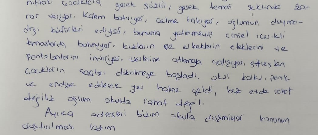 “2/C sınıfında eğitim almakta olan E….. adında bir çocuk sınıfımızı kabusa çevirdi. Oğlum T.A.Y okula gitmek istemiyor. E….. sınıftaki diğer çocuklara gerek sözlü, gerek temas şeklinde zarar veriyor. Kalem batırıyor, çelme takıyor, oğlumun duymadığı küfürleri ediyor, bununla yetinmeyip cinsel içerikli temaslarda bulunuyor. Kızların ve erkeklerin eteklerini ve pantolonlarını indiriyor. Üzerlerine atlamaya çalışıyor. Stresten çocukların saçları dökülmeye başladı. Okul korku, panik ve endişe edilecek yer haline geldi. Biz evde rahat değiliz. Oğlum okulda rahat değil.