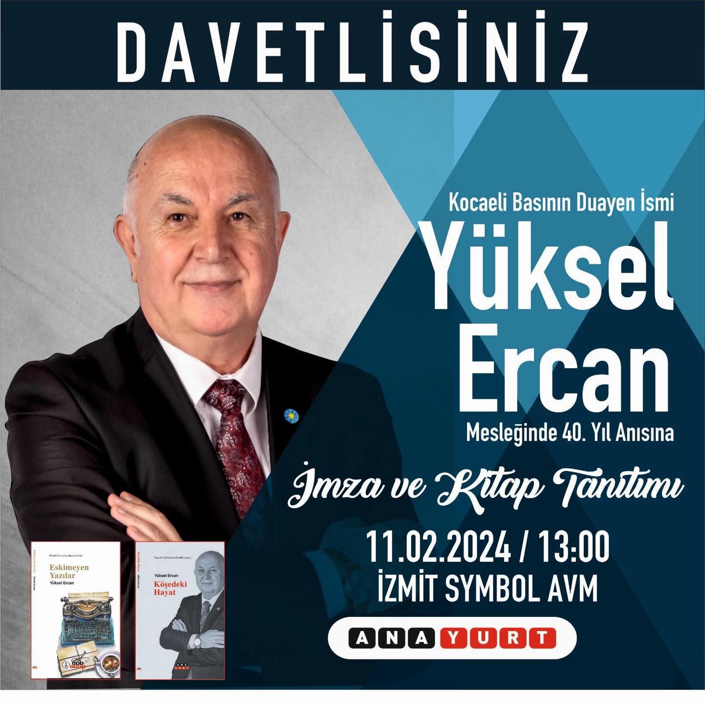 Gazeteci Yazar Yüksel Ercan, meslekteki 40’nci yıl anısına bugün İzmit’te, Symbol AVM’de imza ve kitap tanıtım gününde okurları ve edebiyatseverler ile bir araya gelecek