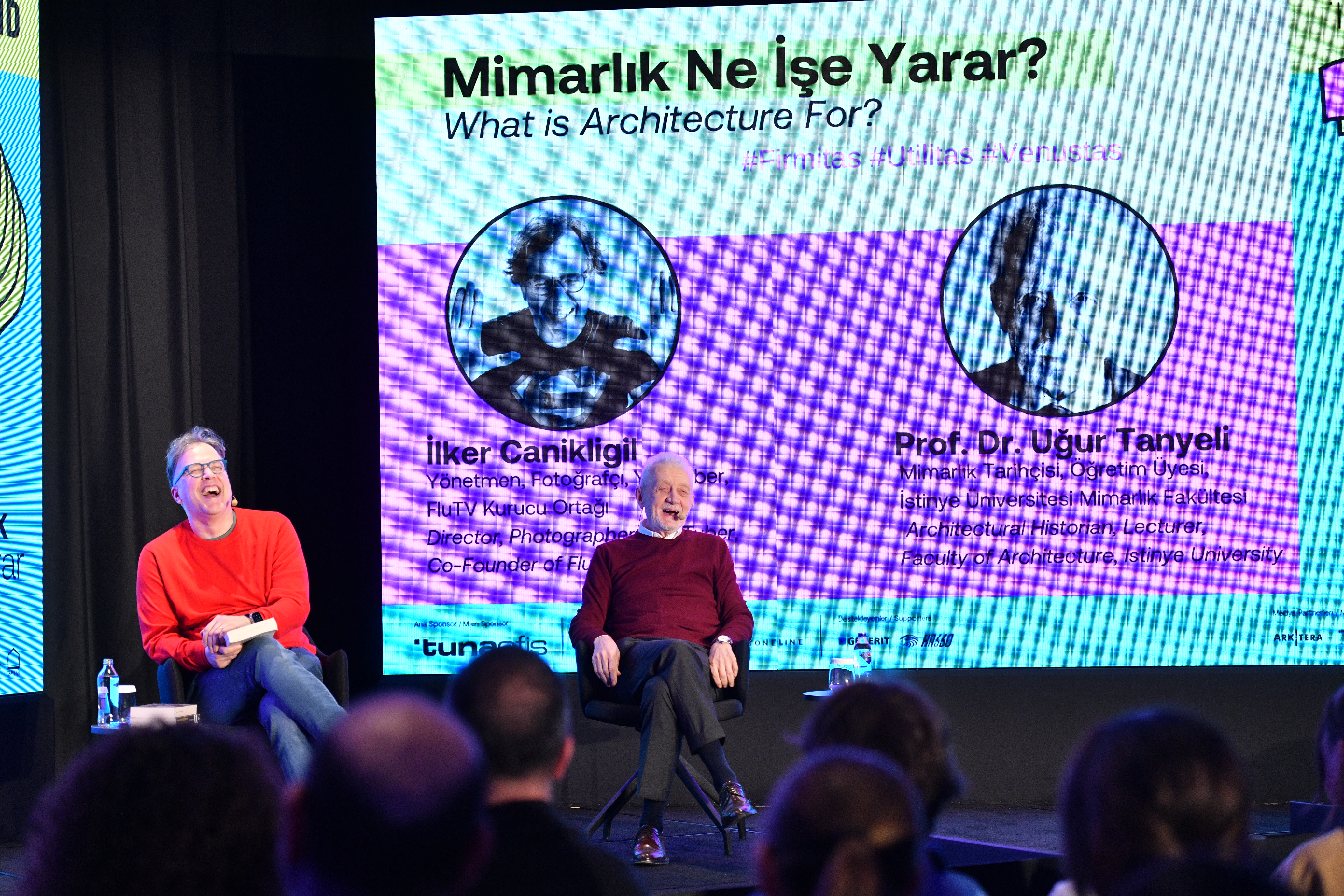 “Mimarlık Ne İşe Yarar?”konferansın adını da taşıyan bu oturumda, Türkiye’nin mimarlık alanında en üretken akademisyenlerinden, mimarlık tarihçisi Prof. Dr. Uğur Tanyeli, sıra dışı yayınlarıyla adından sıkça söz ettiren FluTV Kurucusu İlker Canikligil’in sorularını yanıtladı. Meslek alanı dışından bir entelektüelin, mimarlık düşüncesi emekçisi Uğur Tanyeli ile yapacağı zihin açıcı ve keyifli söyleşi izleyicilere yeni pencereler açtı.