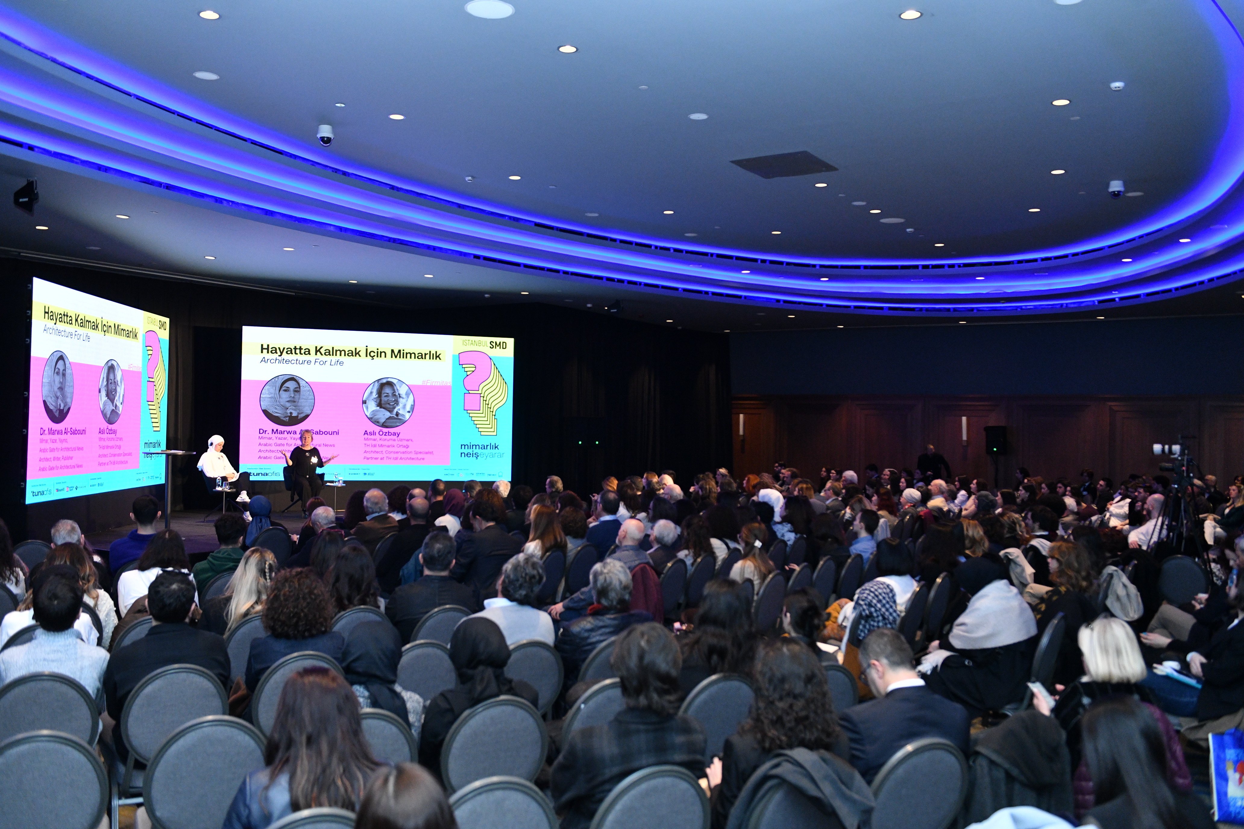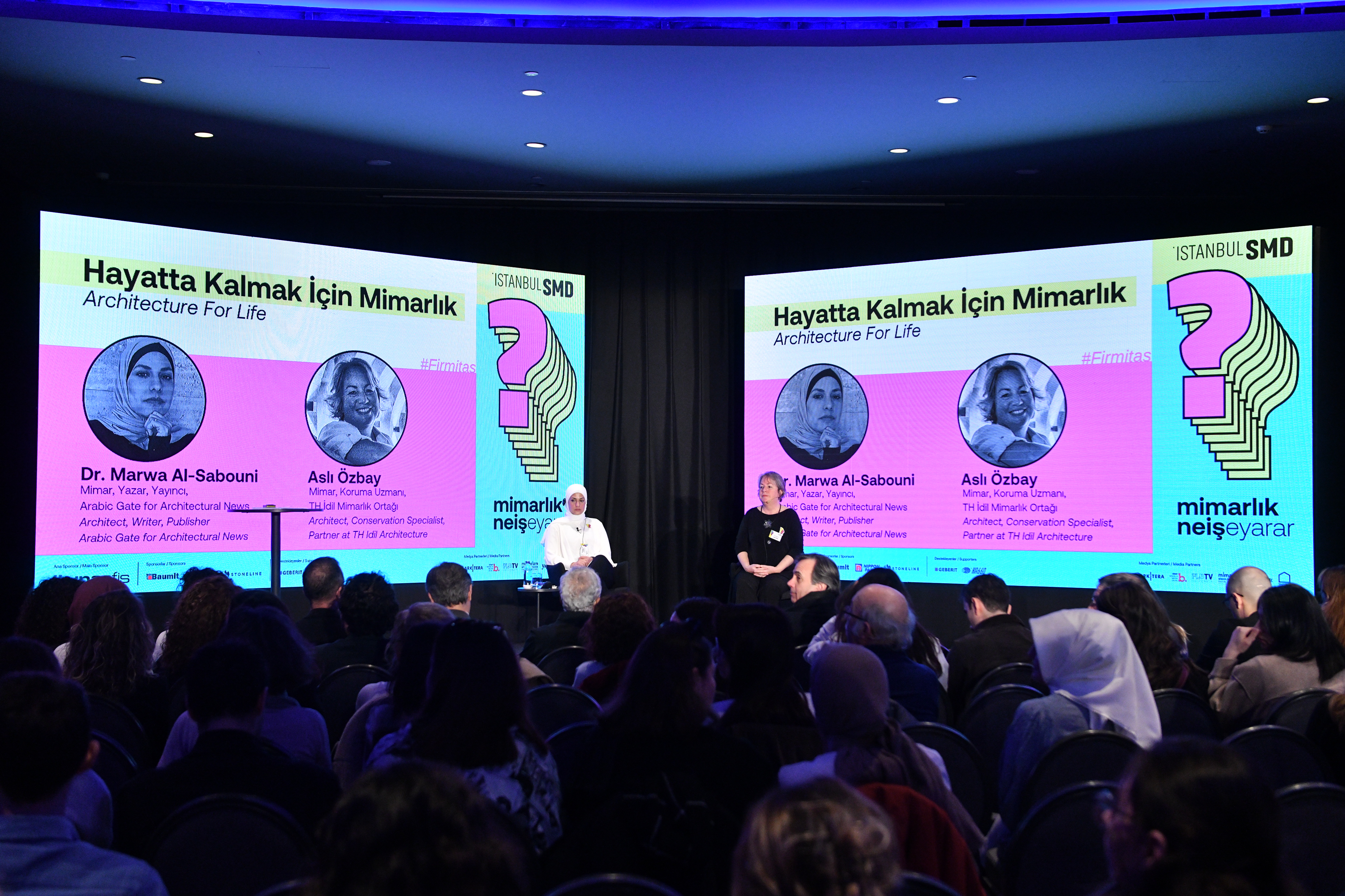 “Hayatta Kalmak İçin Mimarlık” oturumunu sınırın iki yanından, ortak duyarlılıkları olan, ortak bir coğrafyayı, benzer yapı yapma kültürlerini paylaşan ve kendi toplumlarının esenliğine ilişkin kafa yoran iki kadın mimar paylaştı… Türkiye’ye ilk kez gelen, kitapları dünya çapında ses getiren, Suriyeli ödüllü mimar, uluslararası konuşmacı Dr. Marwa Al-Sabouni’ye, Büyük Kahramanmaraş Depremi’nin ardından Hatay, Antakya başta olmak üzere, yeniden imar sürecinde kentsel belleğin korunması, mimarlığın toplumun yaralarını sarabilmesi için çalışmalar yürüten Mimar, Koruma Uzmanı Aslı Özbay eşlik etti.