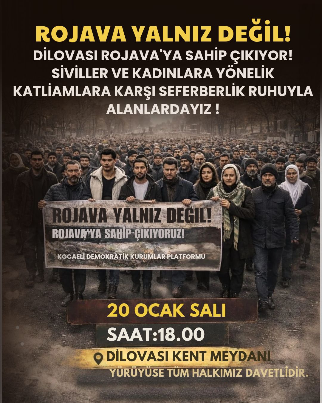 Kocaeli Demokratik Kurumlar Platformu 20 Ocak Salı günü (yarın) akşam 18.00’de katliamlarla gündemden düşmeyen Rojava için, “Rojava yalnız değil. Rojava’ya sahip çıkıyoruz” sloganıyla yürüyüş ve basın açıklaması gerçekleştirecek. Kent meydanındaki eyleme çağrı; “Dilovası Rojava’ya sahip çıkıyor. Siviller ve kadınlara yönelik katliamlara karşı seferberlik ruhuyla alanlardayız. Yürüyüşe tüm halkımız davetlidir” duyurusuyla yapıldı.