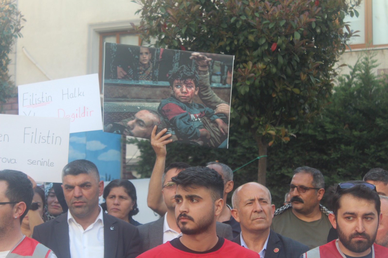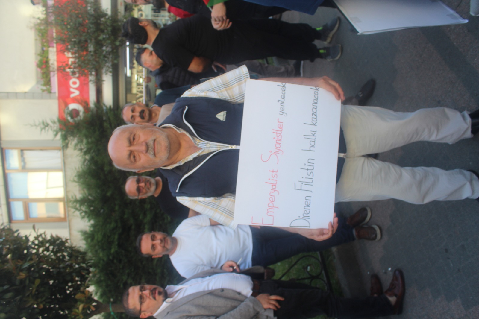 “Mazlum ve masum Filistin halkının acısını yüreklerimizde hissettiğimiz için buradayız. Kadın, çocuk demeden katliamlarına devam eden Amerika’nın kiralık katili İsrail’e dur demek için buradayız. Masum insanların yaşam hakları için buradayız.