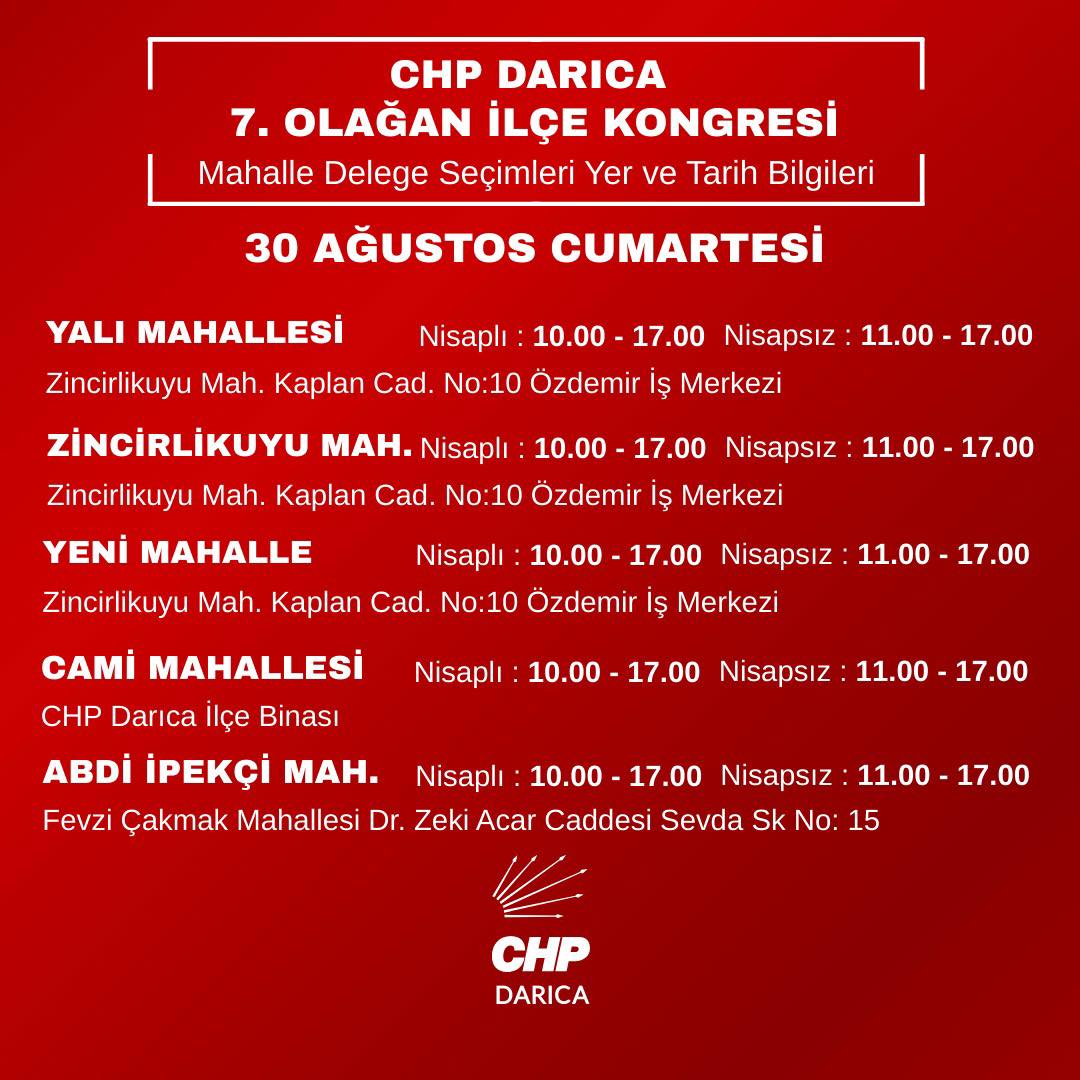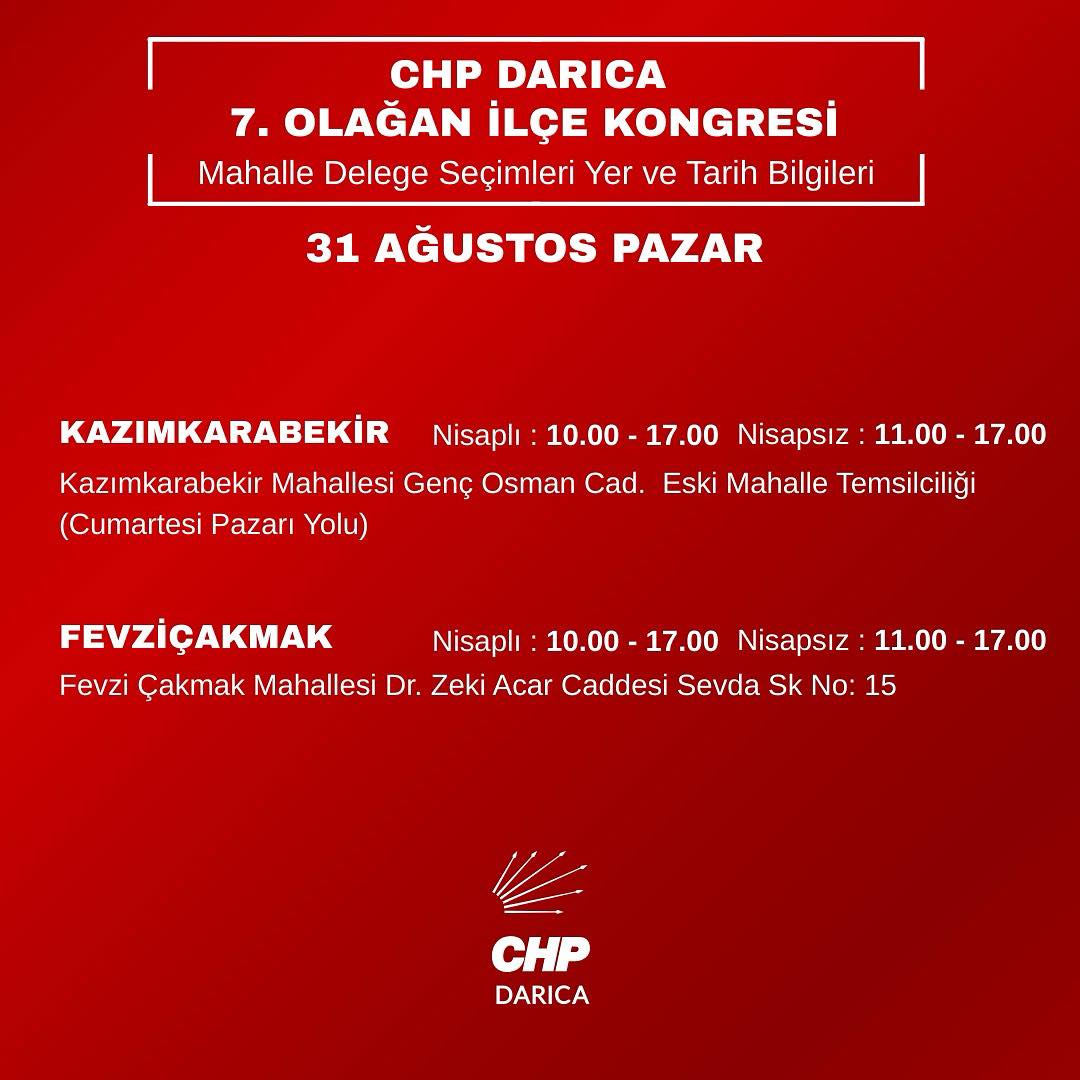Cumhuriyet Halk Partisi - CHP Darıca İlçe Örgütü’nde kongreye doğru mahalle bazlı delege seçimleri 30 Ağustos’ta Yalı, Zincirlikuyu, Yenimahalle, Cami ve Abdi İpekçi’de sürecek. 31 Ağustos’ta Kazım Karabekir ve Fevzi Çakmak ile tamamlanacak. 14 mahalleli ilçede son kongre, kuvvetle muhtemel 07 Eylül Pazar günü en çok delegeye sahip Bağlarbaşı için yine kuvvetle muhtemel CHP ilçe binasında gerçekleşecek.