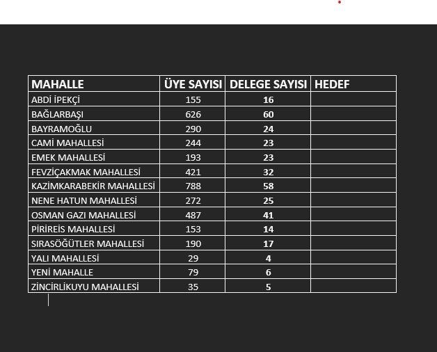 29 üyeli Yalı’da 4, 35 üyeli Zincirlikuyu’da 5, 79 üyeli Yenimahalle’de 6, 244 üyeli Cami’de 23, 155 üyeli Abdi İpekçi’de 16, 788 üyeli Kazım Karabekir’de 58 ve 421 üyeli Fevzi Çakmak’ta 32 olmak üzere toplam 144 delege daha seçilecek. Kazım Karabekir her iki aday için de belirleyici mahallelerden biri olacak.