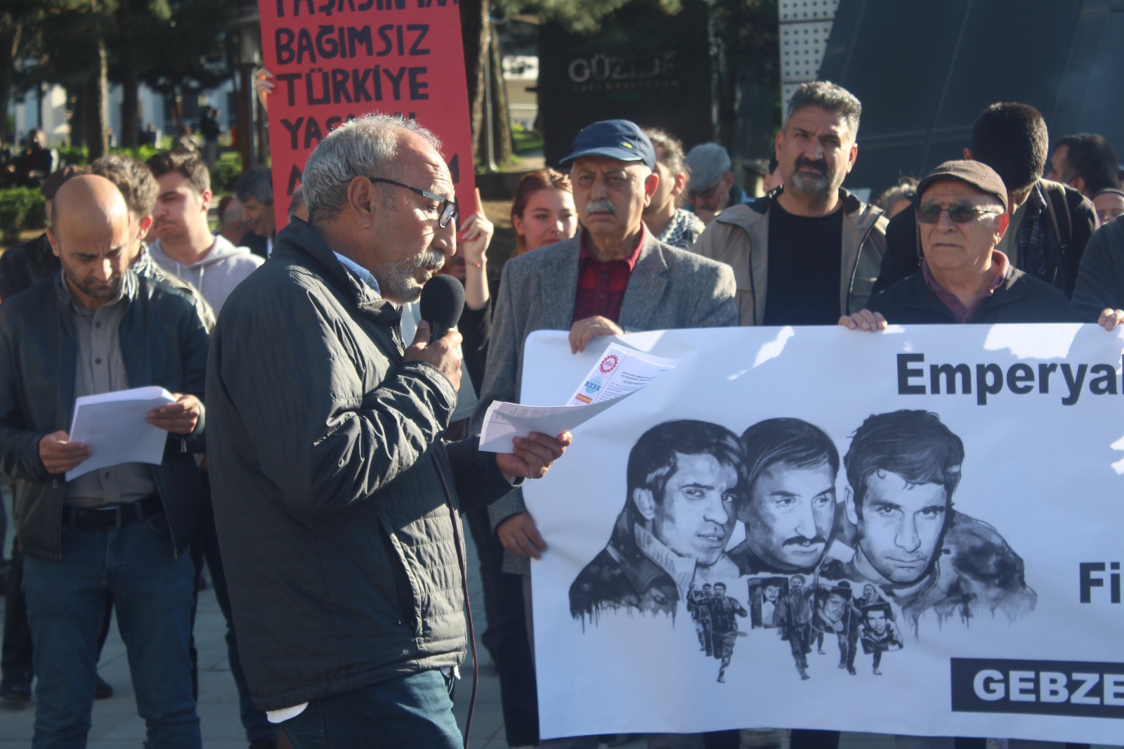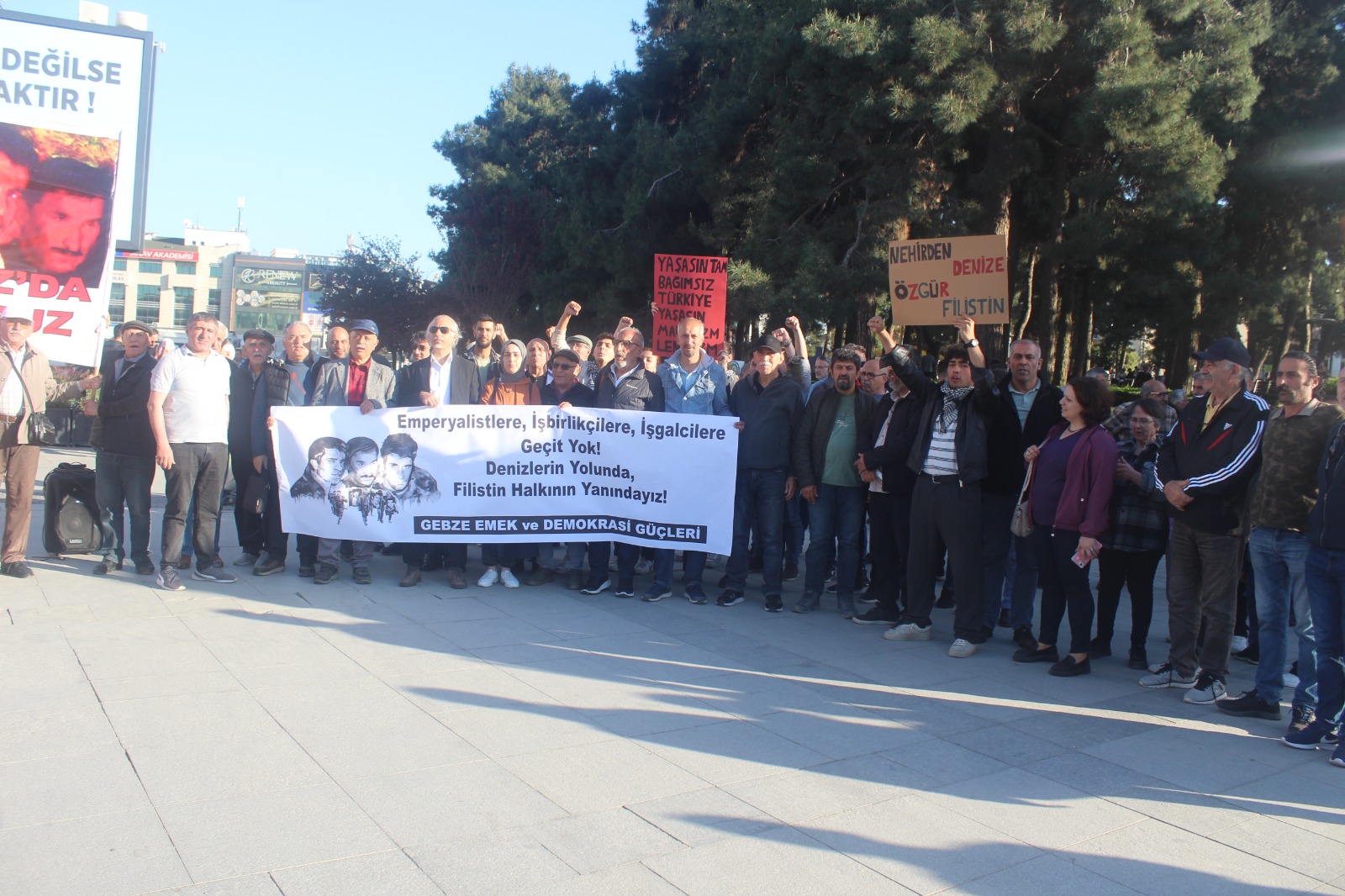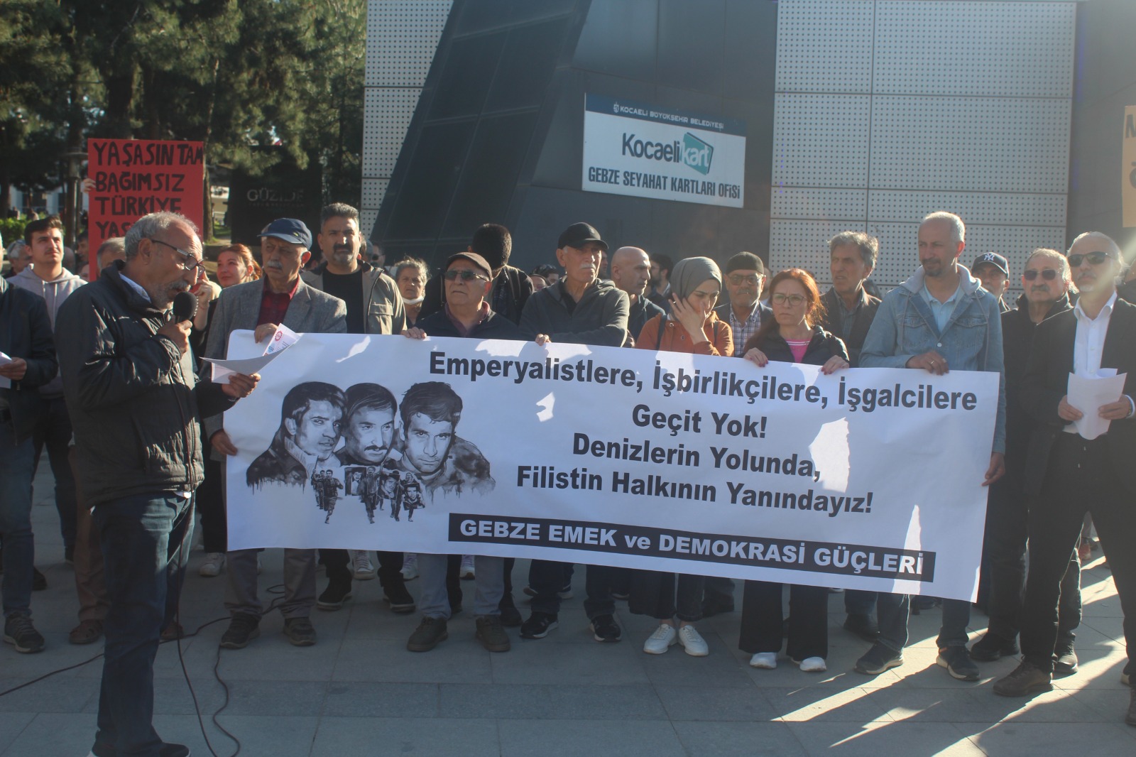 Gebze Emek ve Demokrasi Güçleri, 15 Temmuz Milli İrade Kent Meydanı’na bu sefer idamlarının 52’nci yılında ülkemiz sosyalist hareketinin öncülerinden, Deniz Gezmiş, Yusuf Aslan ve Hüseyin İnan’ı anmak için çıkarken o dönemlerde de, bu dönemlerde de gündemdeki yerini koruyan İsrail’in Filistin işgaline karşı haykırdı. Deniz Gezmiş ve bir grup arkadaşı Filistin davası için söylemlerini eyleme dönüştürerek Filistin’e gitmişti. Basın açıklamasında da o duruşa atıfla, “Emek ve Demokrasi Güçleri olarak, Filistin halkının yanında olduğumuzu bildiriyoruz. Şiddet ve insanlık dışı uygulamalar derhal sonlandırılmalı, Filistin halkının meşru talepleri karşılanmalı; Filistin ve İsrail halklarının bir arada, barış içinde yaşamaları için gerekli her türlü çaba gösterilmelidir” denildi.