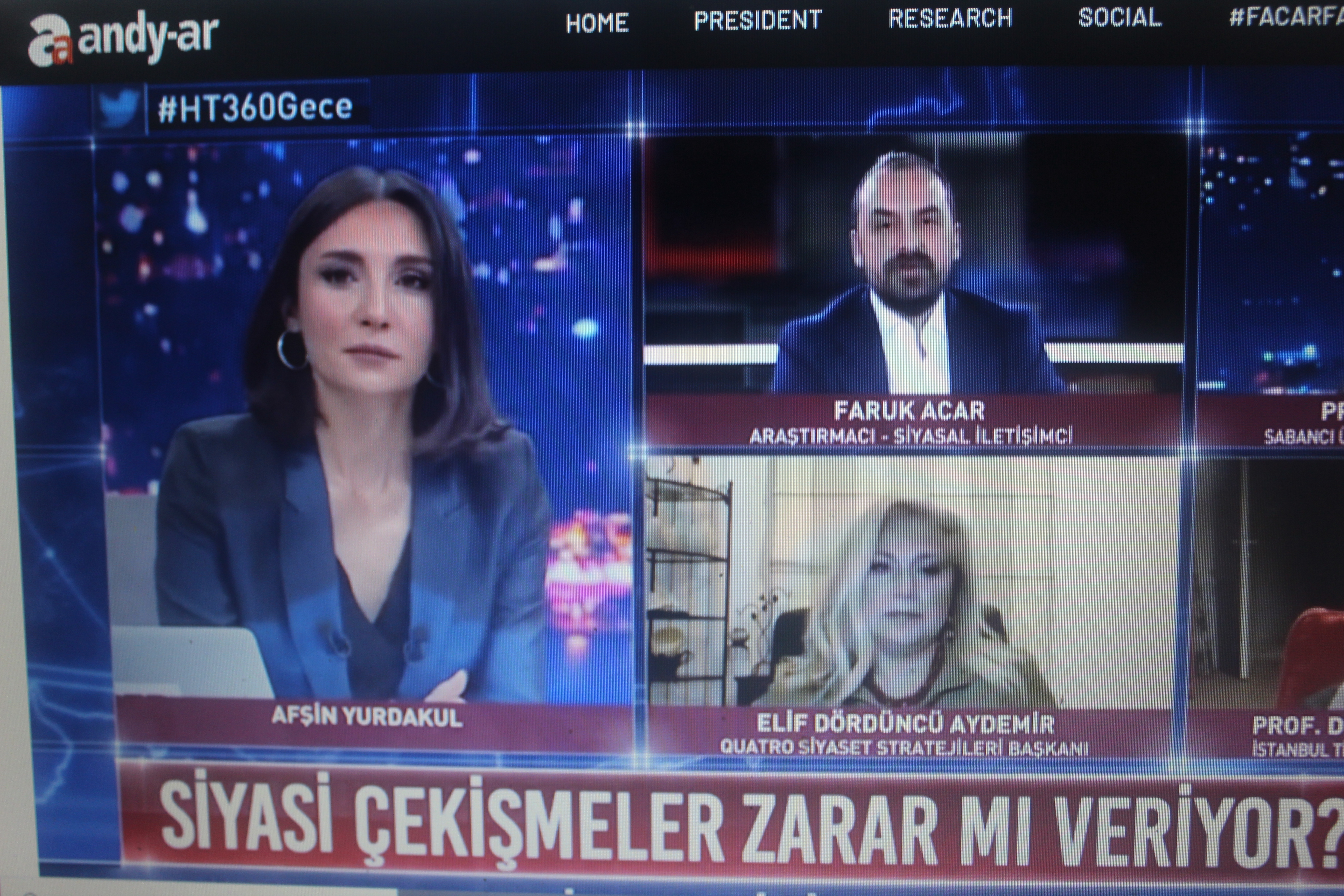 HaberTürk ekranlarında HT360Gece‘nin 10 Mart 2021 tarihinde yayımlanan programda Afşin Yurdakul’un konukları Araştırmacı-Siyasal İletişimci Faruk Acar da yer aldı… Siyaset ile sokak arasında makas aralığının çok büyük olduğunu ve partilerin grup toplantılarında yaptıkları konuşmalar ile sokağın gündemi arasında paralellik izleyen siyasi aktörün Meral Akşener olduğuna dikkat çeken Faruk Acar, pandemi döneminde sokağa inip vatandaşın ve esnafın sorunlarını dinleyen İYİ Parti’nin bir taban oluşturarak kitle partisi haline geldiğini ifade etti.