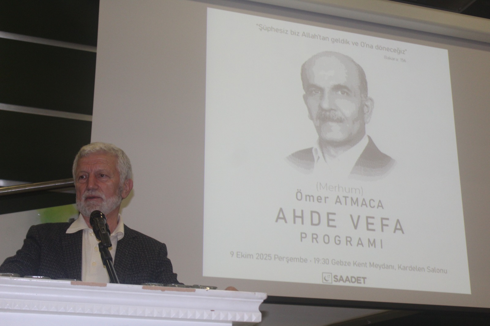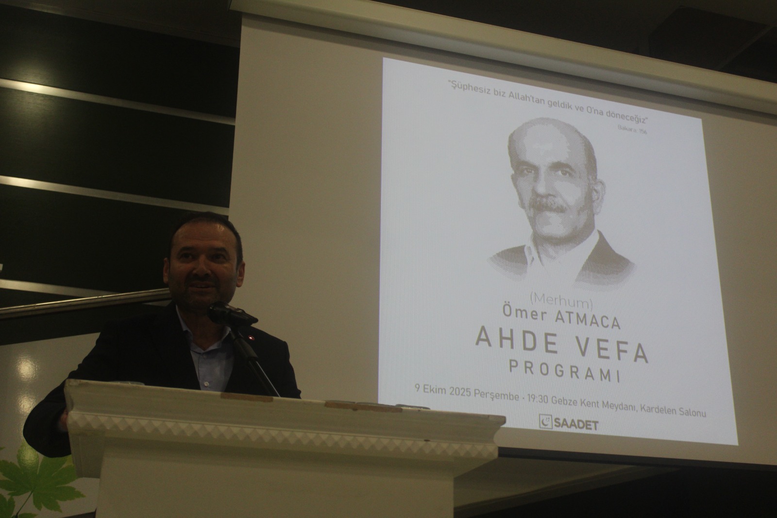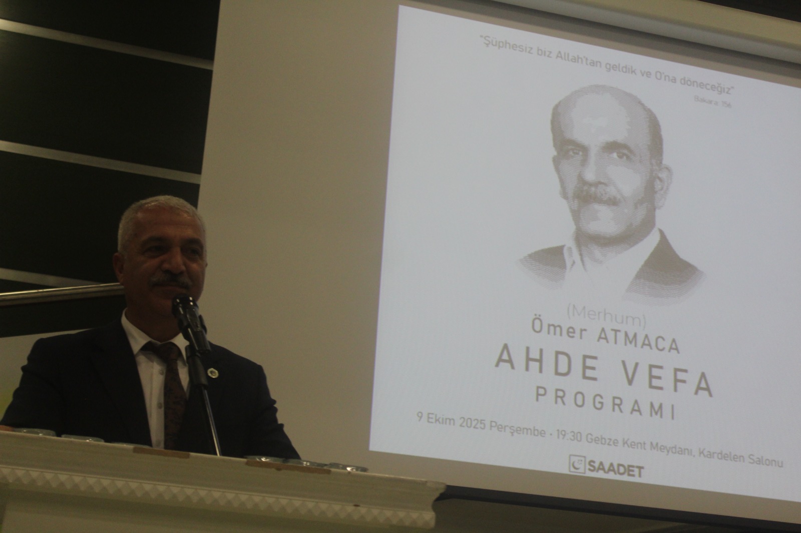 Ömer Atmaca kimine göre bir abi, kimine göre bir ilçe başkanı, kimine göre gönül insanı, kiminin eşi, kiminin babası ve buradaki herkesin ortak değeri olan Ömer abi için biz Saadet Partisi Gebze İlçe Teşkilatı olarak vefatından ötürü ahde vefa gecesi düzenleyeceğiz. Katılımlarınızdan ötürü hepinize ayrı ayrı teşekkür ediyorum.