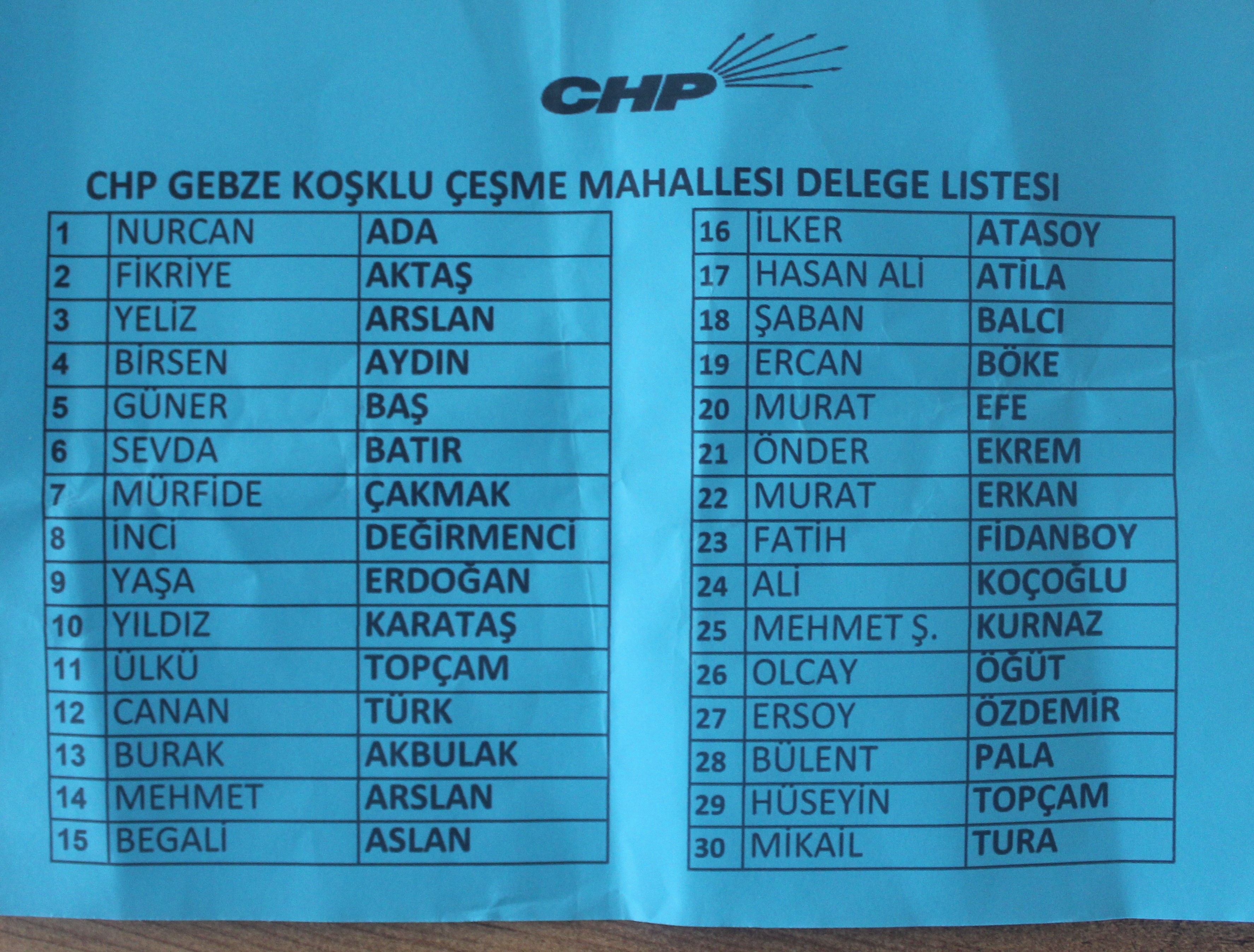 CHP Gebze İlçe Örgütü’nde Köşklüçeşme Mahallesi delege seçimi önceki pazar günü kendi mahallesinde, 539 Sokak içindeki Ekrem Kıraathanesi’nde gerçekleşti. Burada sandık divanı İlçe Başkan Yardımcısı Erol Ateş, Gençlik Kolları Başkanı Atakan Erceiş, Kadın Kolları eski Başkanı Yaşa Erdoğan ve gençlik kolları yönetiminden Hazal Kılıç’tan oluştu.