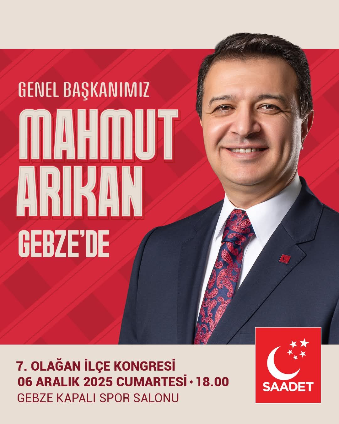 Saadet Partisi Gebze İlçe Teşkilatı’nın olağan ilçe kongresi, 6 Aralık Cumartesi günü (yarın) saat 18.00’de Gebze Kapalı Spor Salonu’nda, Saadet Partisi Genel Başkanı Mahmut Arıkan’ın katılımıyla gerçekleştirilecek.