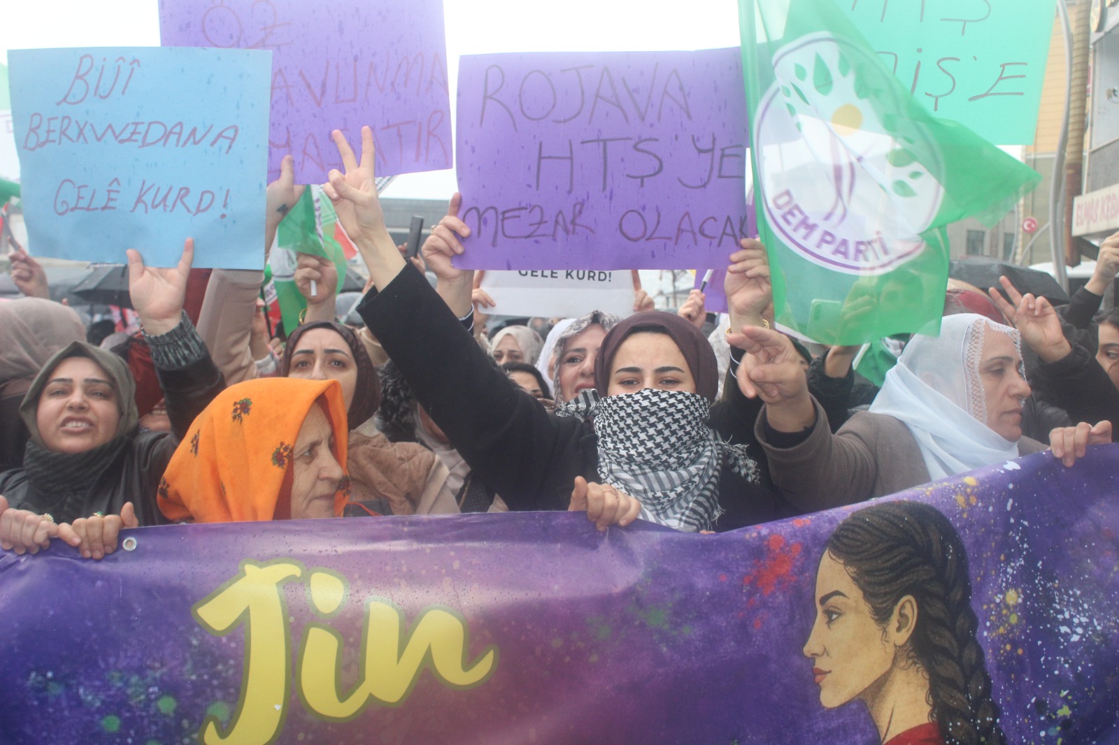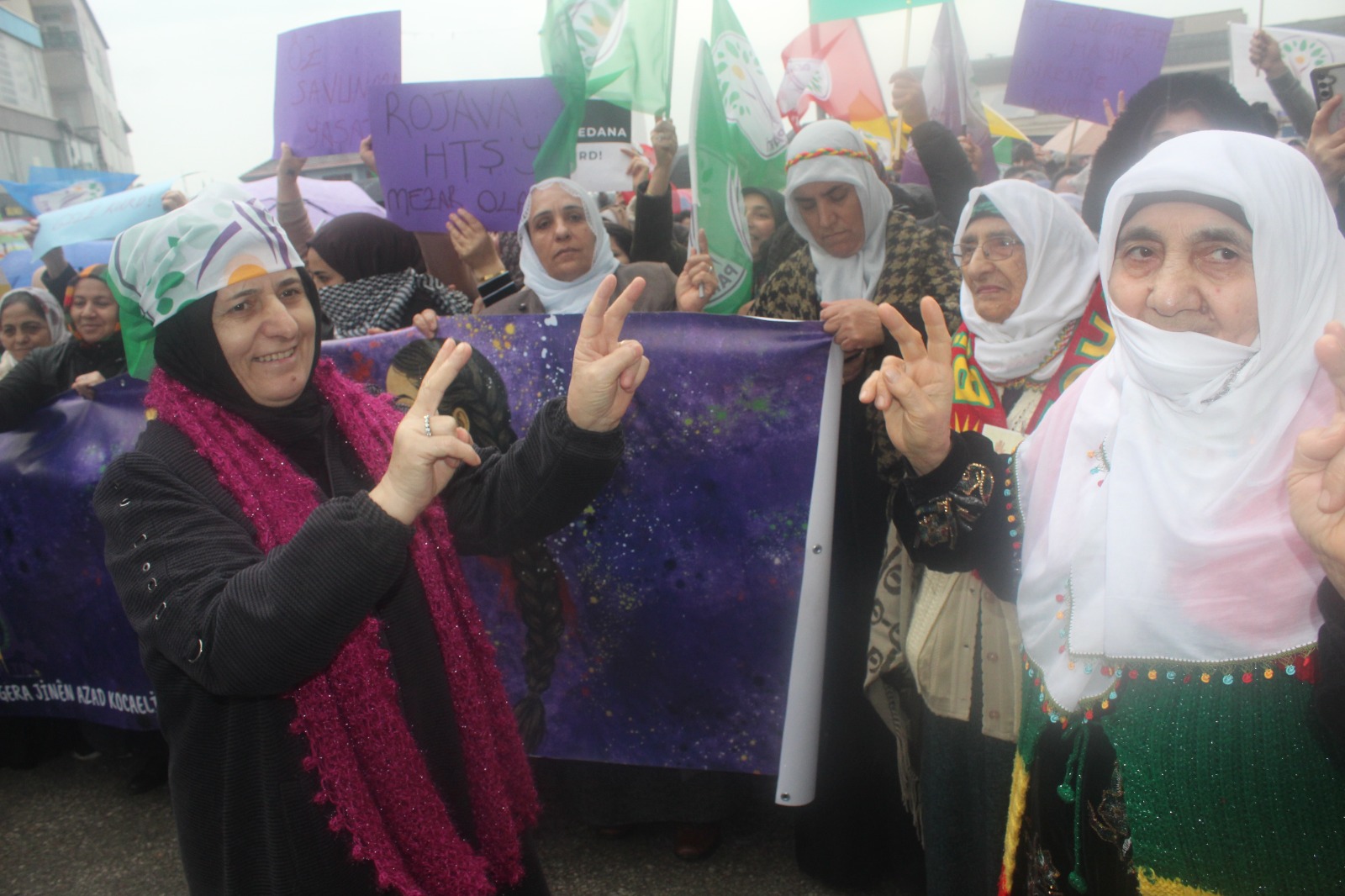 “Biliyoruz ki kapitalist modernitenin kurmak istediği sisteme gerekçe demokratik ve kadın özgürlükçü bir sistemin 14 yıldır Rojava’da hayat bulmasıydı. Buna karşı olanlar topyekûn bir komplo süreci başlatıp üzerimize geldiler. Ama gelinen süreçte karşı eylemlerle alanlarda olduk ve bu sürece sahip çıkıldı. Rojava hepimizin emeğidir. Asla geri adım atmayacak ve hep birlikte kadın özgürlükçü bir sistemi kurmaya adayız.