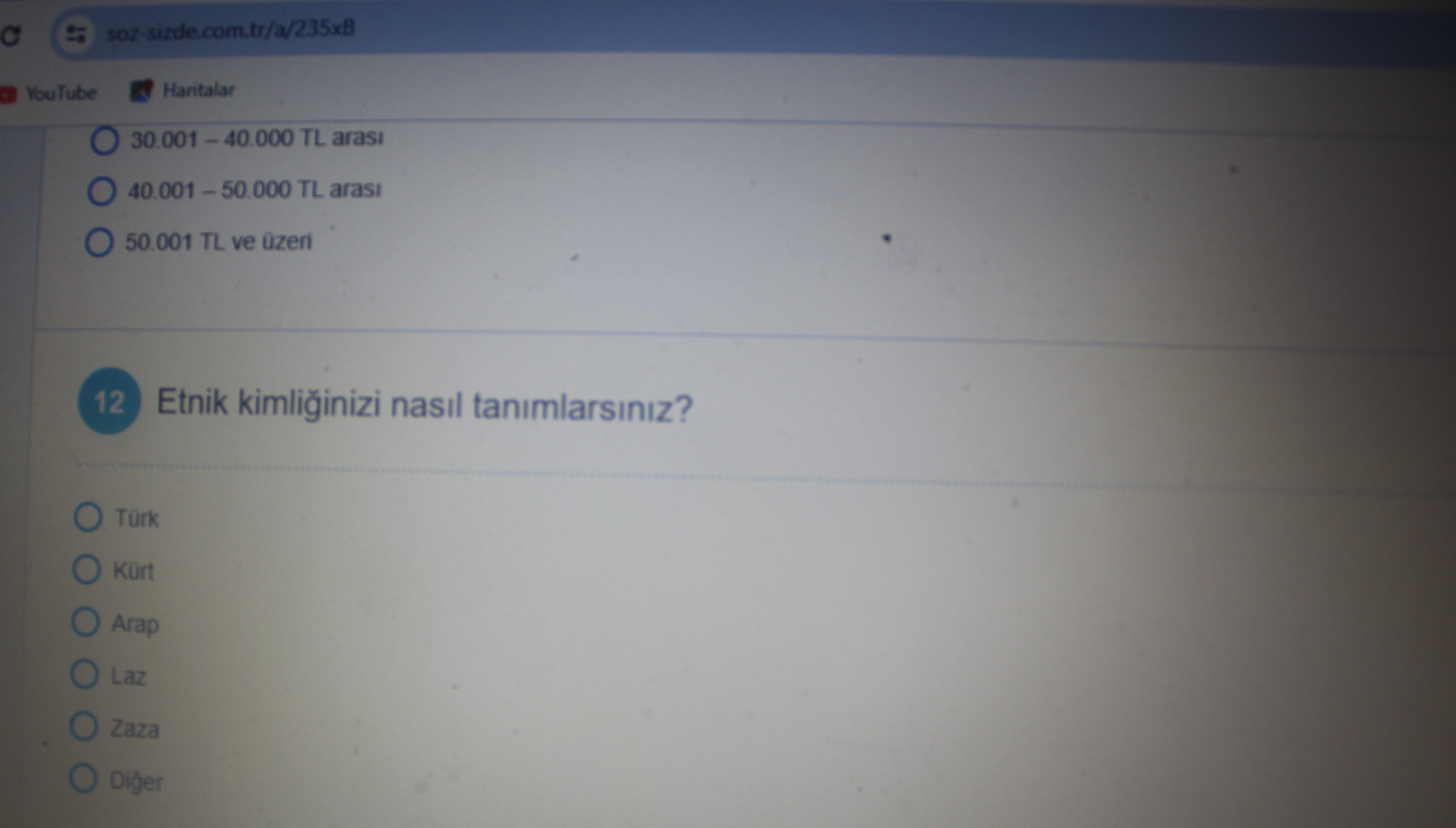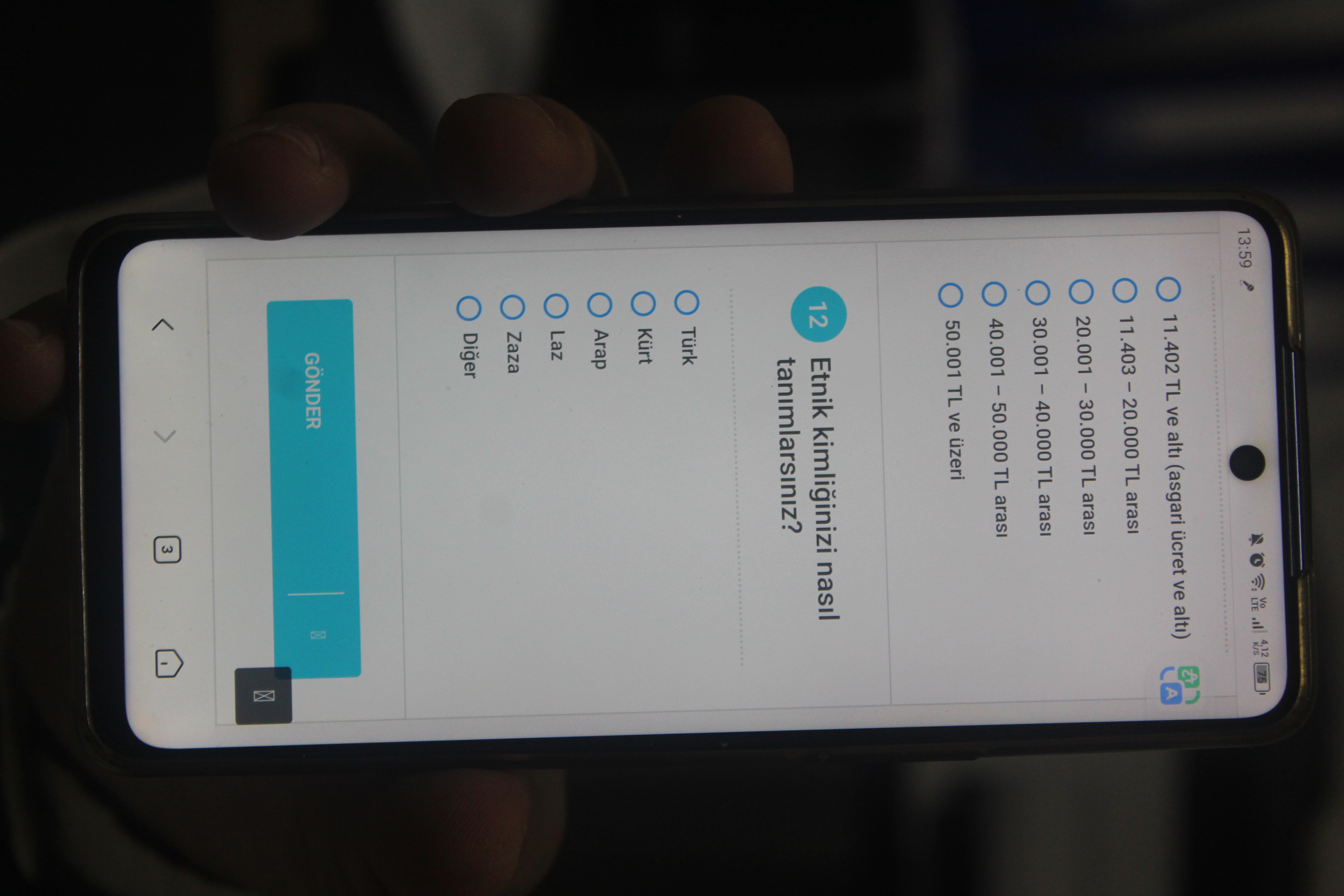 12’nci soruda ise, “Etnik kimliğinizi nasıl tanımlarsınız?” başlığı altında “Türk”, “Kürt”, “Arap”, “Laz” ve “Zaza” seçenekleri sıralanıp diğer etnik kimlikler, “Diğer” seçeneğinde birleştirilmiş.