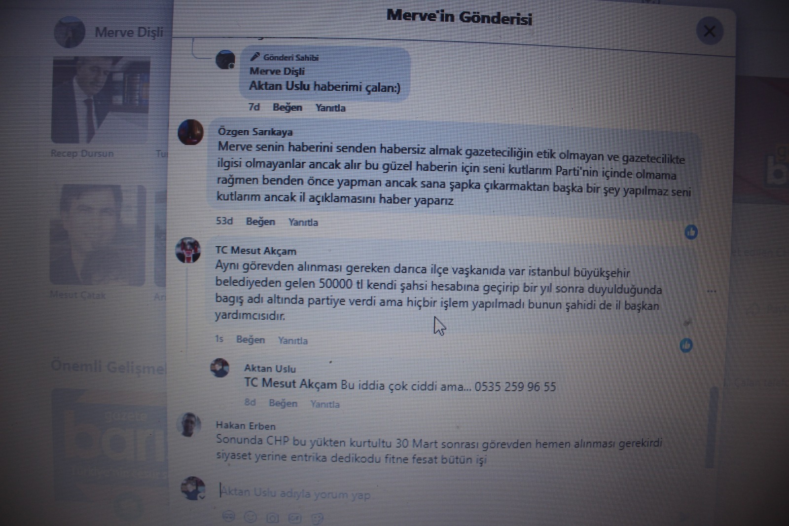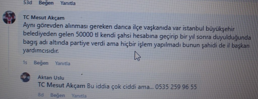 - Destekçilerinizden Mesut Akçam, Kocaeli Barış’ta Merve Dişli’nin Körfez İlçe başkanının görevden alındığına dair haberin altına, “Aynı görevden alınması gereken Darıca İlçe Başkanı da var. İBB’den gelen 50 bin TL’yi şahsi hesabına geçirip bir yıl sonra duyulduğunda bağış adı altında partiye verdi ama hiç işlem yapılmadı. Bunun şahidi de il başkan yardımcısıdır?” yazdı. Gerçi sonra sildi ama, nedir mesele?