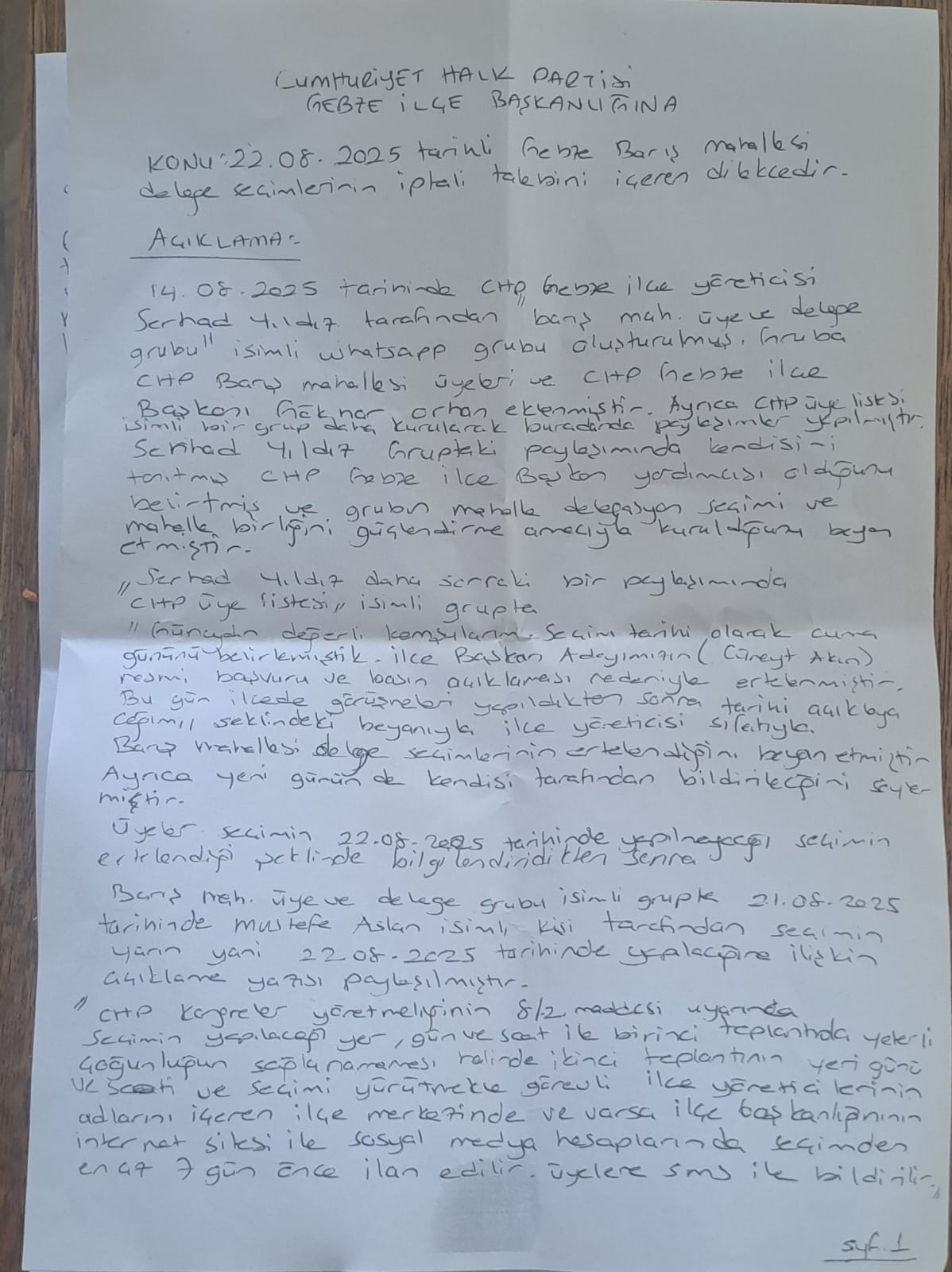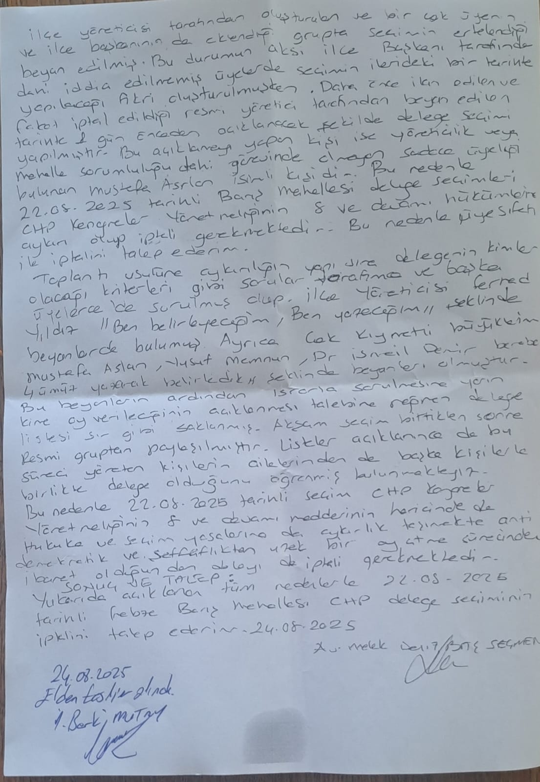 Yukarıda açıklanan sebeplerden ötürü mahallemizdeki delege seçiminin iptalini talep ederim. (24 Ağustos 2025)