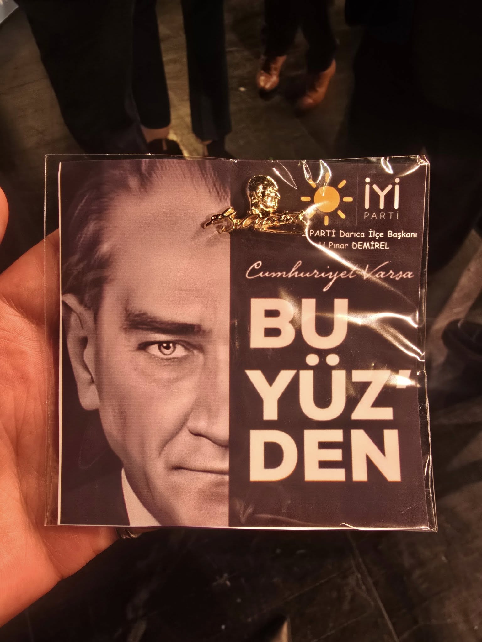 Kongre Ulu Önder Atatürk’ün ölüm yıldönümünden bir gün önce gerçekleşti. İYİ Parti Darıca İlçe Başkanı Hatice Pınar Demirel kongrede katılımcılara, “Cumhuriyet varsa bu yüzden” yazısı ve Atatürk fotoğrafının yer aldığı rozet dağıttı. Demirel bu jestiyle dikkatleri üzerine çekti. Takdir edildi.
