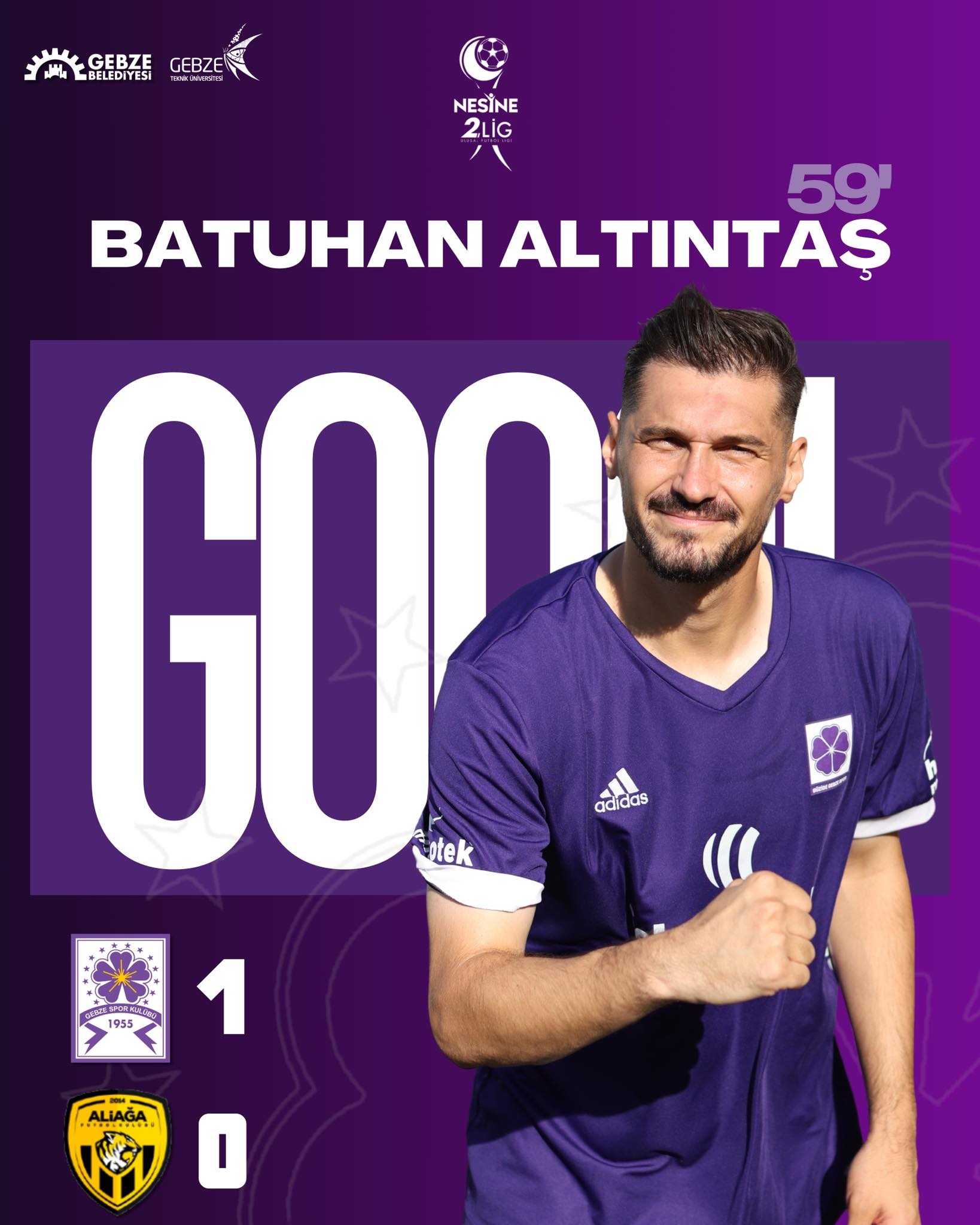 Nesine 2’nci Lig Kırmızı Grup’ta temsilcimiz Güzide Gebzespor rakibin daha üstün olduğu maçta şampiyonluk adayı Aliağa Futbol A,Ş’yi Mustafa Batuhan Altıntaş’ın golüyle yendi. Furkan Taş bitime bir dakika kala penaltı çıkardı. Menekşeler sonuca geçen hafta diğer Mustafamız, Mustafa Pektemek ile gitmişti.