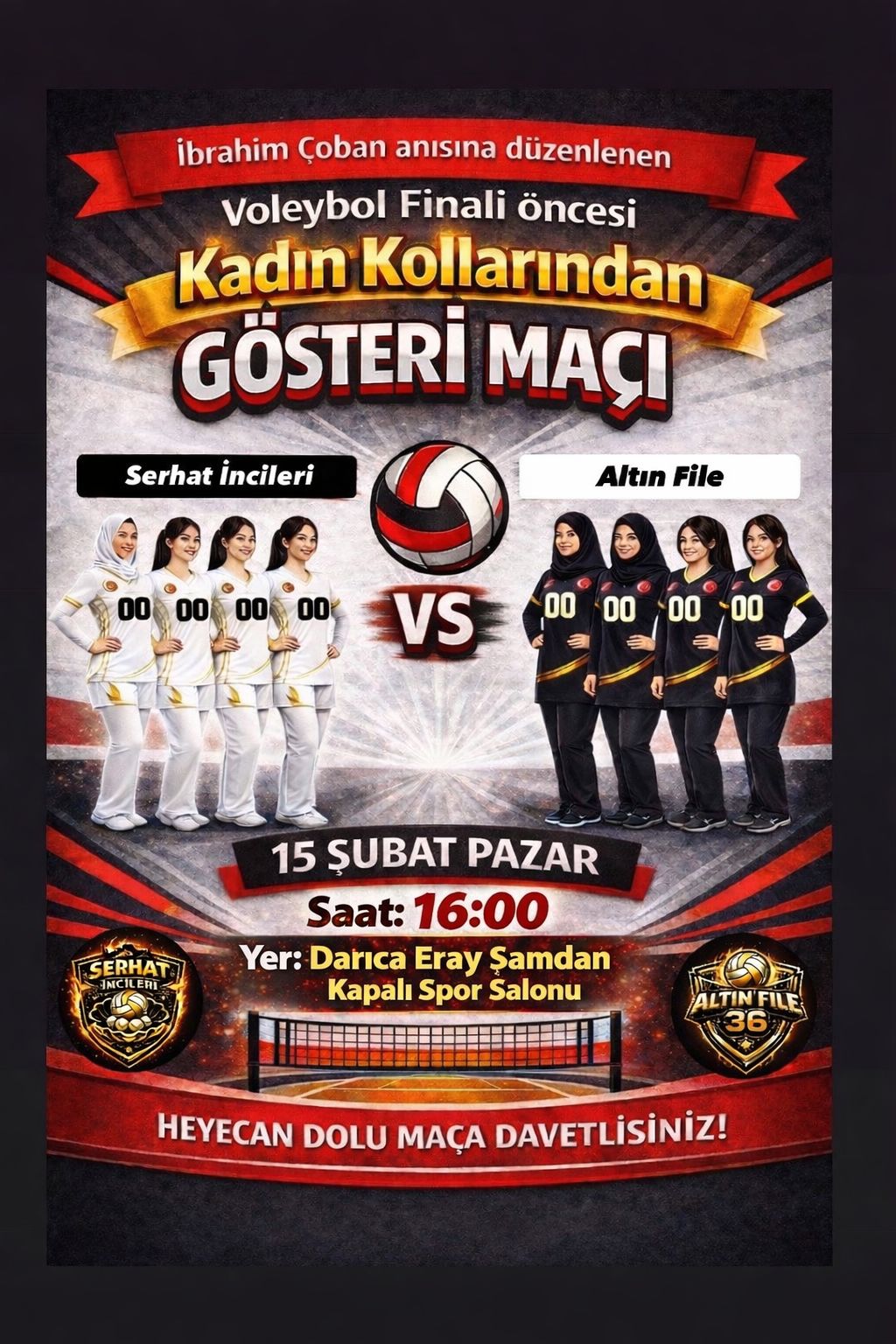 Final maçından önce ise derneğin kadın kollarının organizasyonunda iki kadın voleybol takımı, Serhat İncileri ve Altın File takımları gösteri maçında karşılaşacak. Bu maç saat 16.00’da başlayacak. Peşi sıra voleybol turnuvasının final maçı, hemen ardından ödül töreni gerçekleşecek.