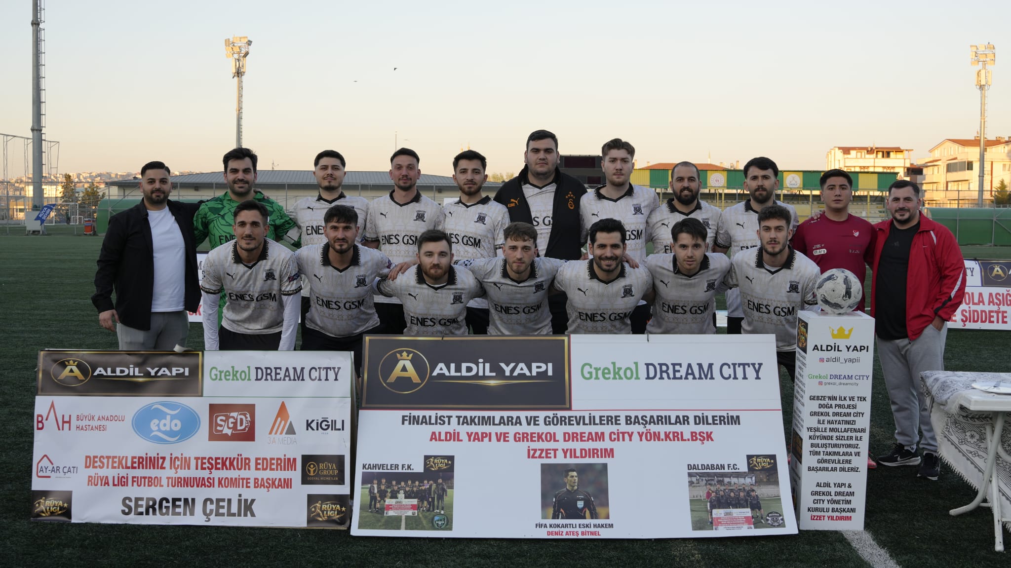 Darıca’da bu yıl ilki düzenlenen Rüya Lig’de ilk şampiyonluk kupasını müzesine götüren takım, finalde Daldaban F.C’yi 1-0 mağlup eden Kahveler FK takımı oldu. Genç iş insanı Sergen Çelik’in ev sahipliğinde, Aldil Yapı ve Grekol Dream City Yönetim Kurulu Başkanı İzzet Yıldırım’ın ana sponsorluğunda, Darıca Nene Hatun Stadı’ndaki final maçını Darıca Kaymakamı Yaşar Dönmez, Darıca Belediye Başkanı Muzaffer Bıyık, Darıca İlçe Emniyet Müdürü Vedat İşleyen ile bürokrasi, iş ve spor camiasından davetliler ile futbolseverler izledi. FİFA kokartlı eski hakem Deniz Ateş Bitnel’in yönettiği maç Aldil Yapı Pazarlama Müdürü Nergis Yıldırım’ın başlama düdüğü, İzzet Yıldırım ve Sergen Çelik’in santra vuruşu ile başladı. Kaymakam Yaşar Dönmez ve Belediye Başkanı Muzaffer Bıyık maçlar öncesi turnuva tertip komitesini ve turnuvaya destek veren iş insanlarını tebrik ederek finalist takım ve hakemlere başarılar diledi.