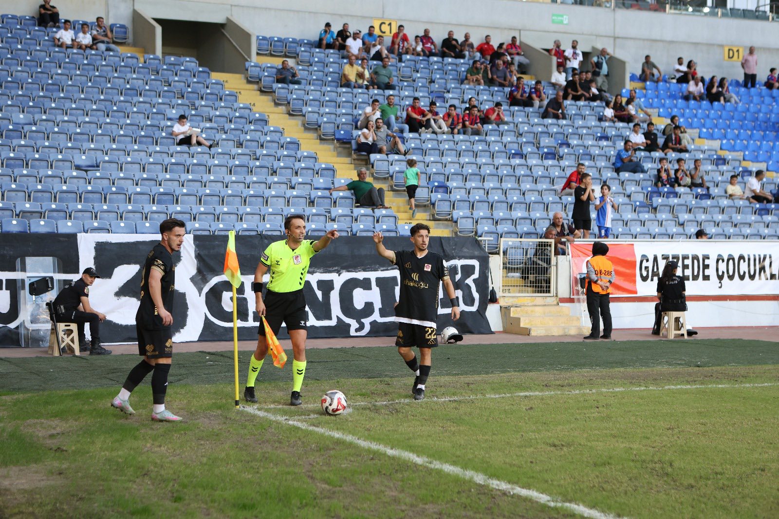 İlk yarının bitiş düdüğünün ardından Hakem Muhammet Alperen Çopur ve yardımcıları Yeni Mersin İdman Yurdu taraftarının protesto ıslıkları altında soyunma odasına yöneldi.