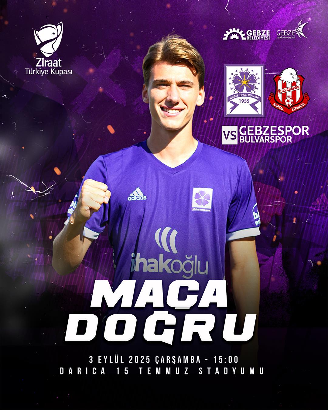 Nesine 2’nci Lig Kırmızı Grup’ta ilk iki maçını kazanarak sezona iyi bir giriş yapan temsilcimiz Güzide Gebzespor yarın (03 Eylül Çarşamba) kupa mesaisinde, Ziraat Türkiye Kupası 1’nci tur maçında İstanbul, Kartal’ın 3’ncü Lig’deki temsilcisi Bulvarspor’u ağırlayacak. Ligde ilk iç saha maçını stadın zemininin yetişmesinden ötürü Gebze’de, Alaettin Kurt Stadı’nda oynayan temsilcimiz kupa maçını ise Darıca’da oynayacak. Darıca İlçe 15 Temmuz Stadı’nda oynanacak ve saat 15.00’te başlayacak maçı Şanlıurfa Bölgesi üst klasman hakemlerinden Yusuf Adnan Kendirciler yönetecek. Kendirciler’in yardımcılıklarını yine Urfa’dan Şükrü Çavcı ve Ozan Gürleyük yapacak. Maçın dördüncü hakemi ise Siirt'ten, Umut Nasrullah Özhelva.