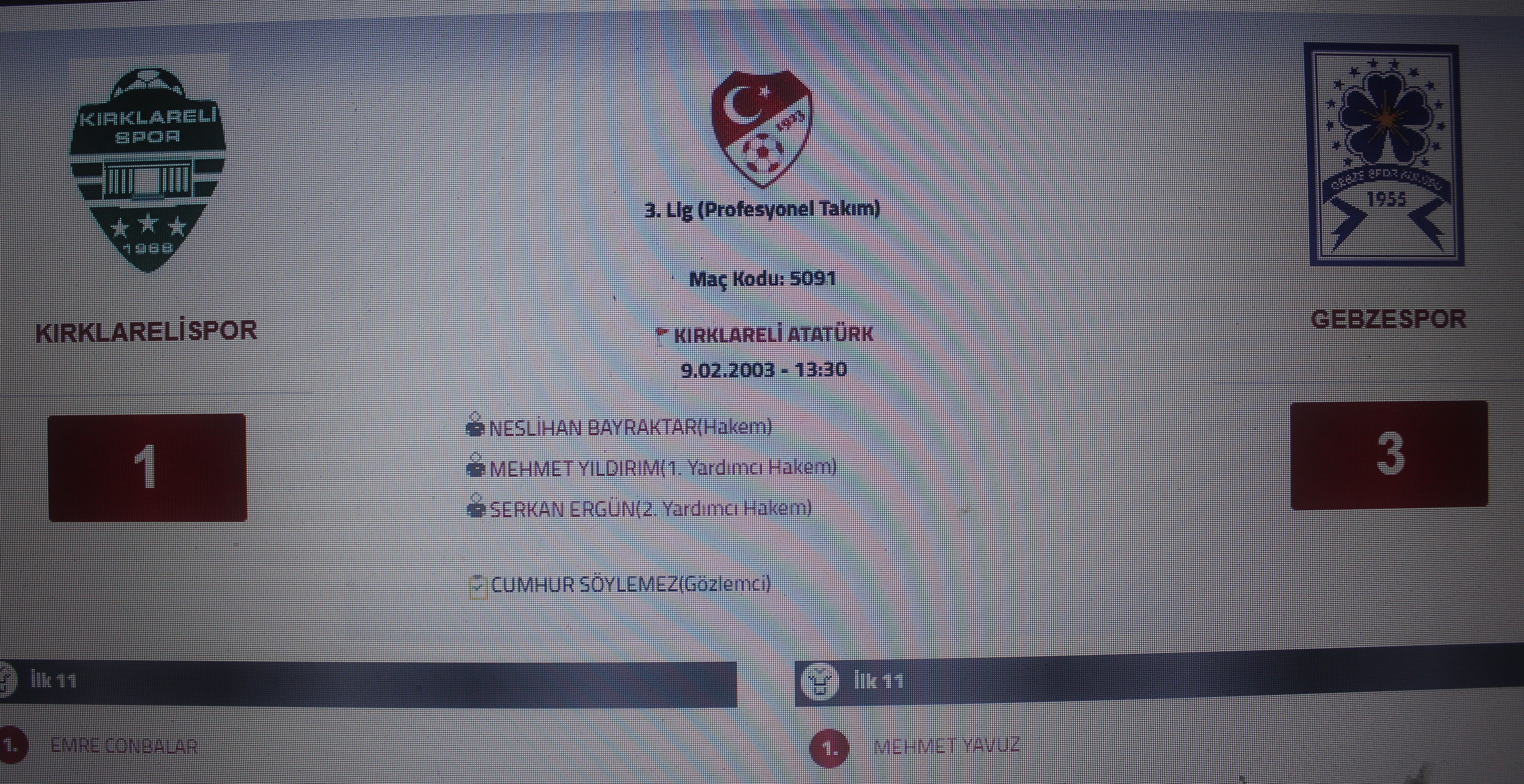 09 Şubat 2003 – 3’ncü Lig / Kırklarelispor – Gebzespor: 1 – 3