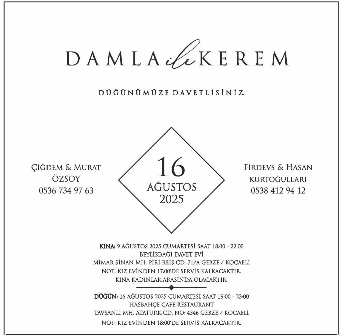 Çiftin düğünü 16 Ağustos Cumartesi günü akşamı Gebze’nin Tavşanlı Mahallesi, Atatürk Caddesi üzerindeki Hasbahçe Kafe Restaurant’ta 19.00 – 23.00 saatleri arasında gerçekleşecek. Kınaları ise 09 Ağustos Cumartesi günü akşamı 18.00 – 22.00 saatleri arasında Gebze Mimar Sinan Mahallesi, Piri Reis Caddesi, No: 71 adresindeki Beylikbağı Davet Evi’nde yakılacak. Kına kadınlar arasında olacak.