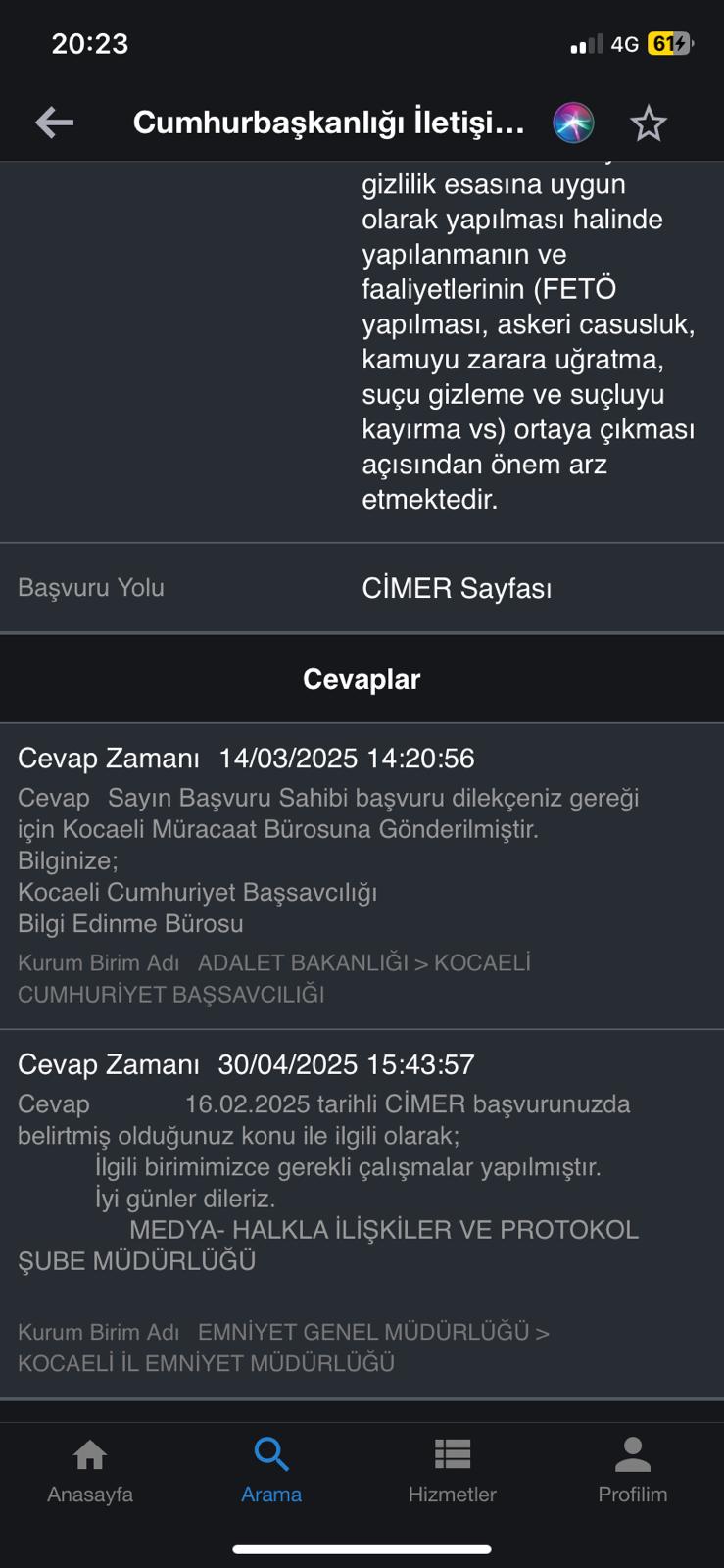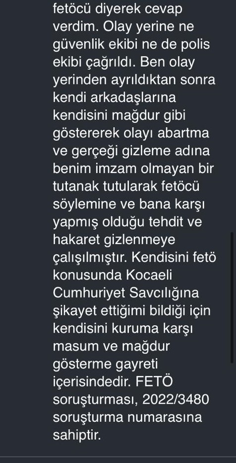 Arkasından, CİMER üzerinden İçişleri Bakanlığı’na başvuru yapıyorum FETÖ ihbarı konusunda. Kocaeli İl Emniyet Müdürlüğü’ne düşüyor. Müdürlükteki Medya Tanıtım ve Protokol Şube Müdürlüğü cevap veriyor. Şahıs bildiğiniz korunuyor. Hazırladığım ihbar dilekçesinden ötürü Saraybahçe Polis Merkezi’ne gidiyor. İhbar dilekçemde bir kelime olsun hakaret ifadesi yok. ‘H.Ç’ye hakaretten işlem yapın’ diyor. Beni gözaltına alıp hakaretten işlem yapıyorlar. Savcı tahkikat üzerinden iddianame düzenliyor. Mahkemeye çıkıyor, hakaretten yargılanıyorum.